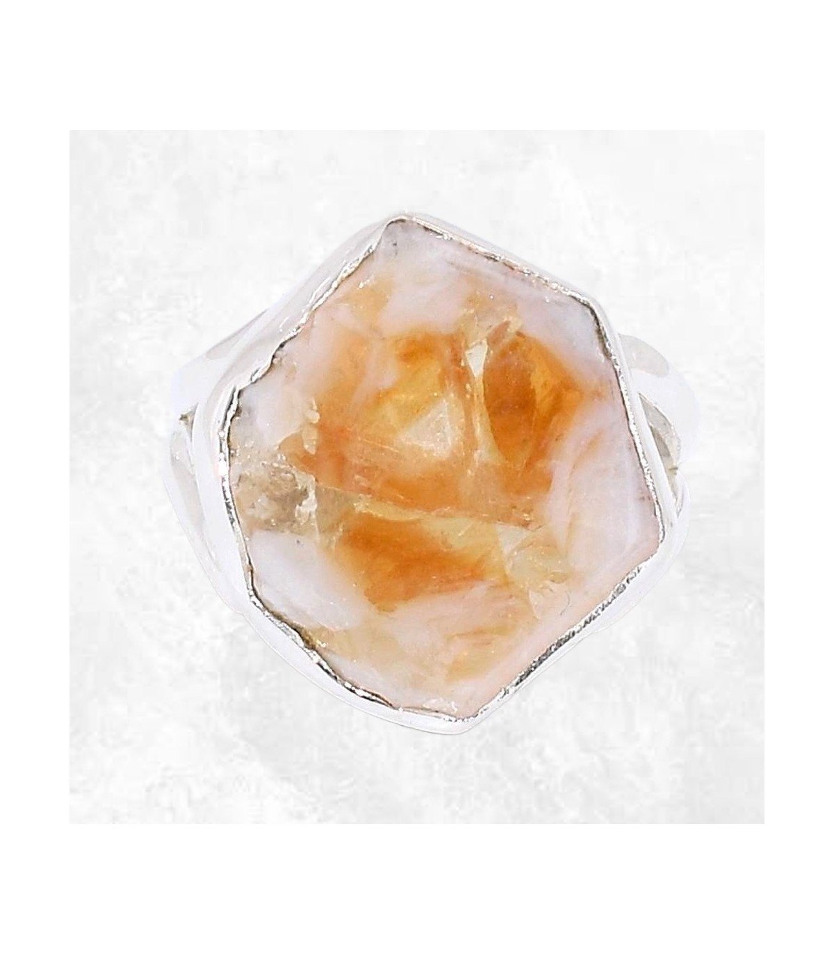 Cette bague met en lumière une Citrine stalactite naturelle non traitée, une formation rare où la pierre révèle ses cercles internes et ses nuances dorées cristallisées. Issue des gisements du Brésil, cette Citrine se distingue par son aspect organique et sa texture rayonnante. La monture en argent massif 925 poinçonné enveloppe la pierre tout en laissant apparaître sa structure brute et lumineuse, offrant un bijou à la fois solaire, authentique et singulier.