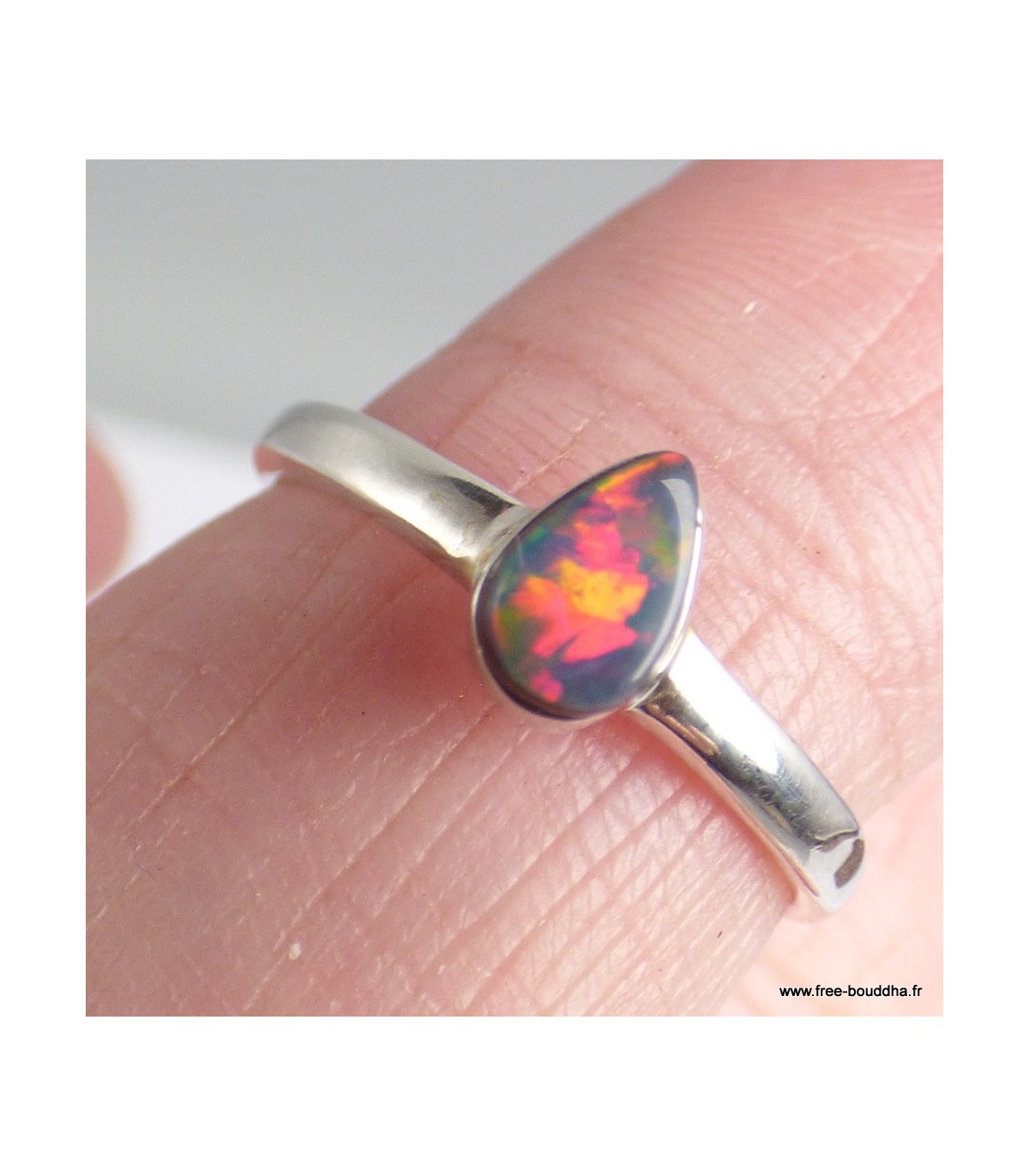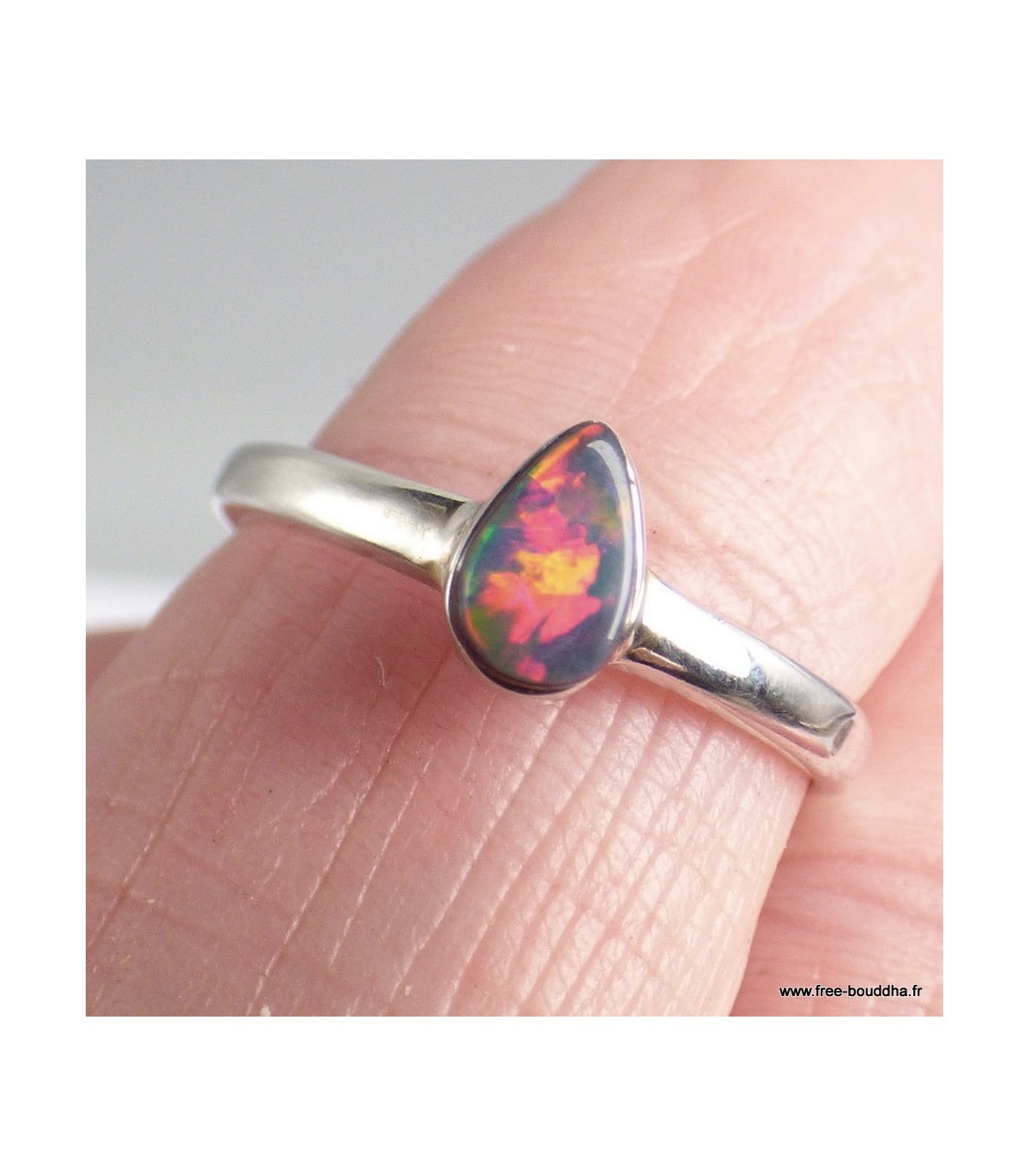 Cette bague délicate met en lumière une opale australienne authentique, reconnue pour ses jeux de lumière irisés et ses reflets changeants. Taillée en forme goutte, elle dévoile des nuances subtiles qui varient selon l’angle et la lumière, évoquant les paysages minéraux et les ciels lumineux de l’Australie.