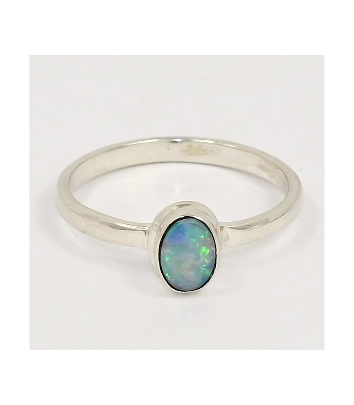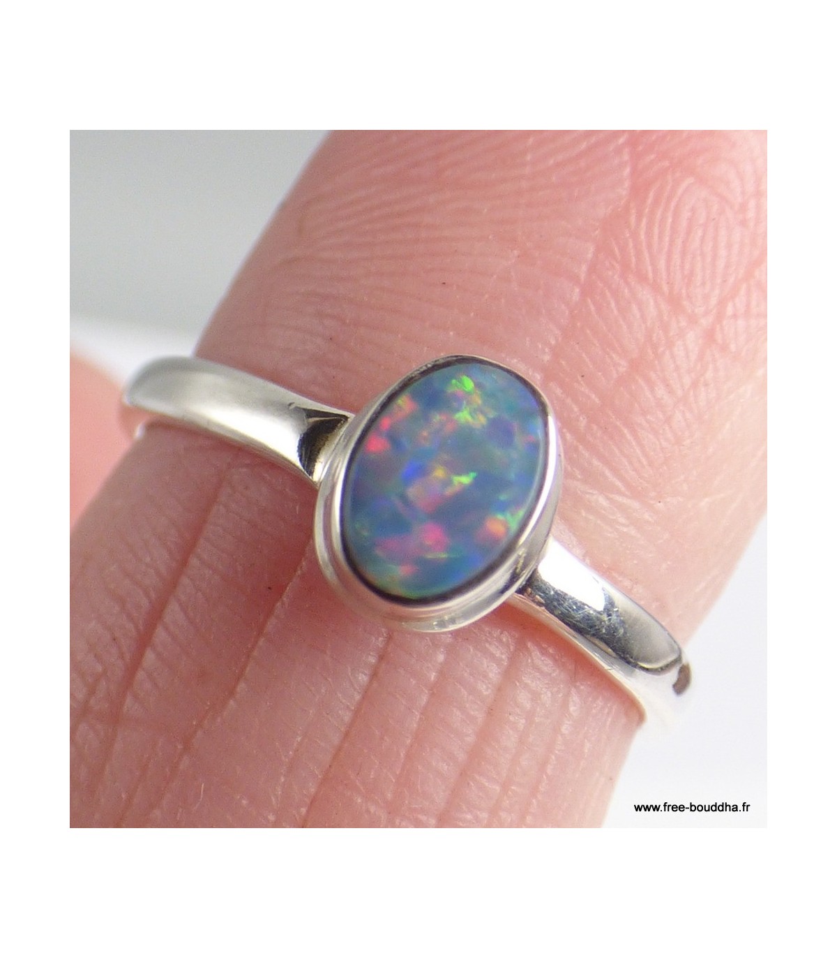 Cette bague délicate met en lumière une opale australienne authentique, reconnue pour ses jeux de lumière irisés et ses reflets changeants. Taillée en forme ovale, elle dévoile des nuances subtiles qui varient selon l’angle et la lumière, évoquant les paysages minéraux et les ciels lumineux de l’Australie.