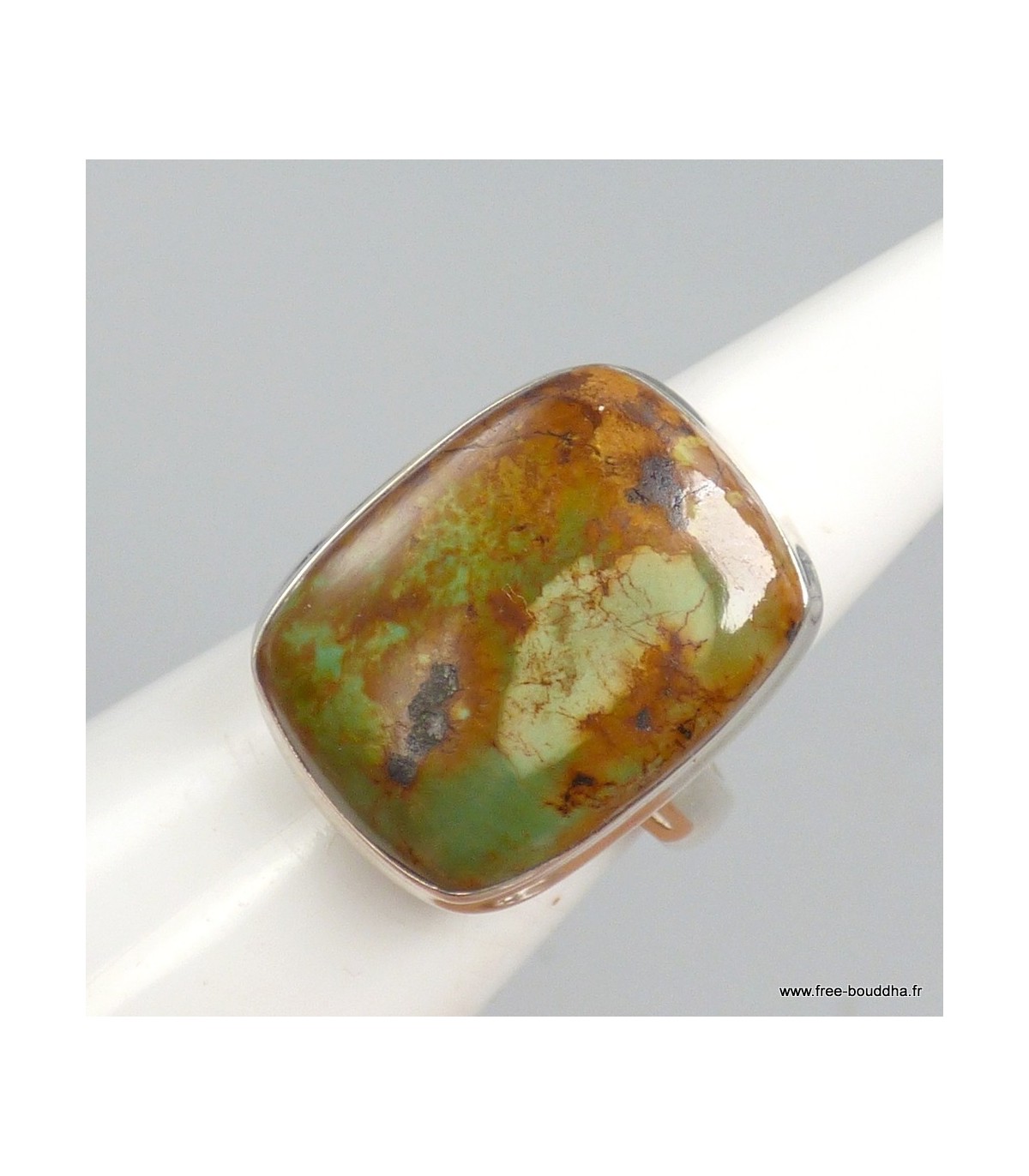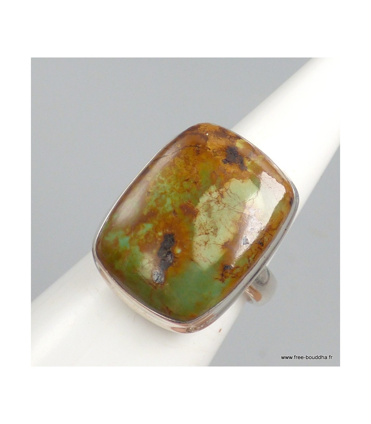 Cette bague met en valeur une Turquoise Américaine véritable, facilement reconnaissable à ses nuances vertes et fauve, caractéristiques de ce gisement rare. Contrairement à la plupart des turquoises, celle‑ci ne présente pas la couleur turquoise, ce qui en fait une pierre singulière, recherchée et expressive. Sa forme rectangulaire met en avant ses motifs naturels, tandis que la monture en argent massif 925 poinçonné assure élégance, solidité et authenticité.