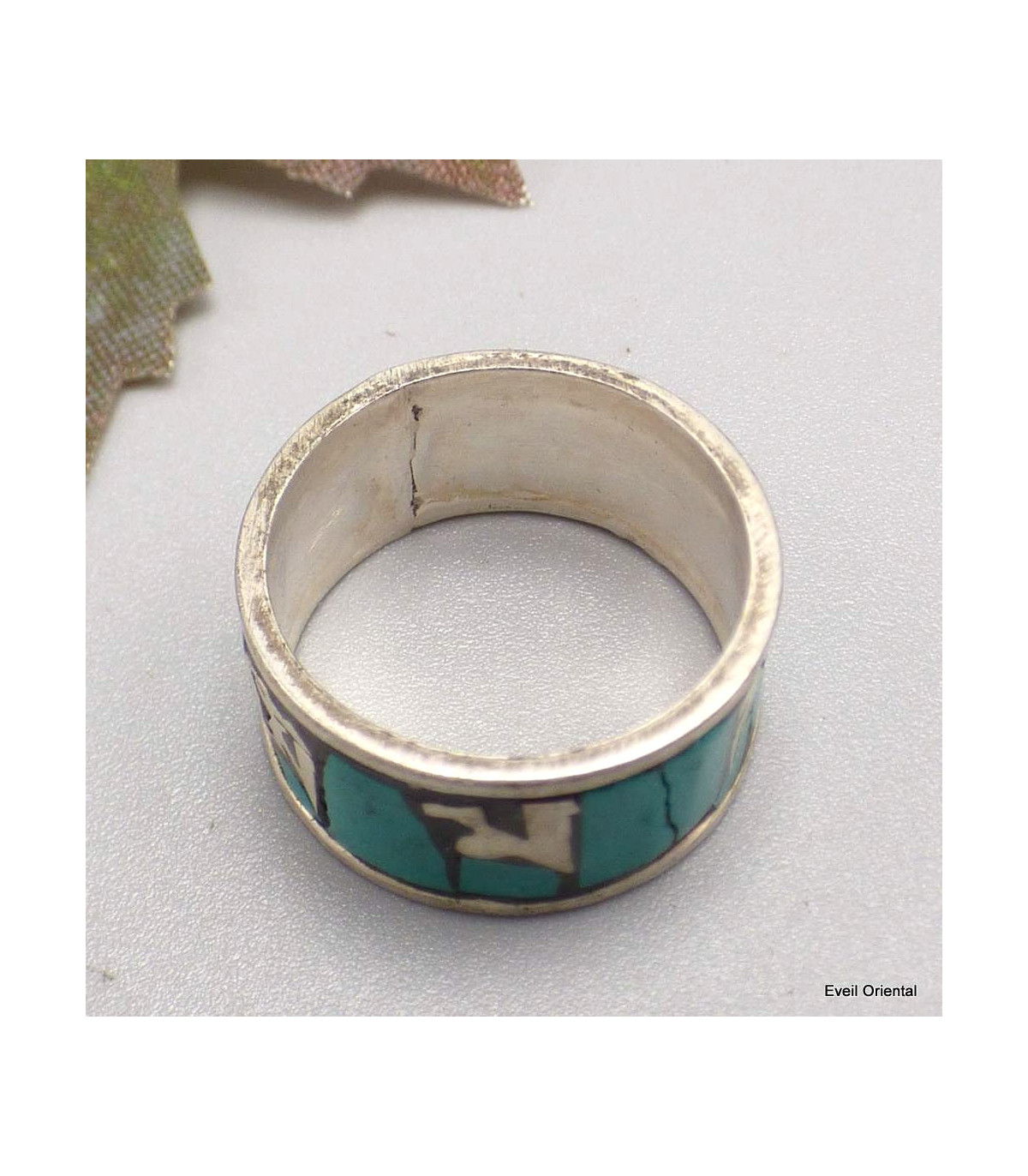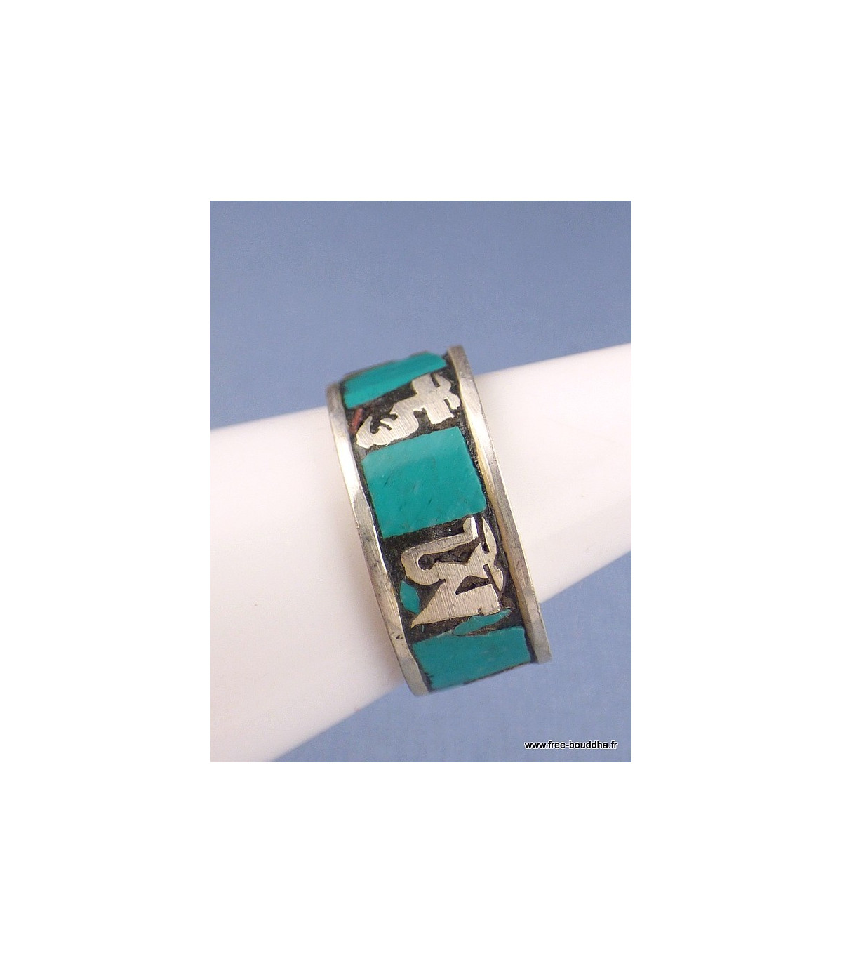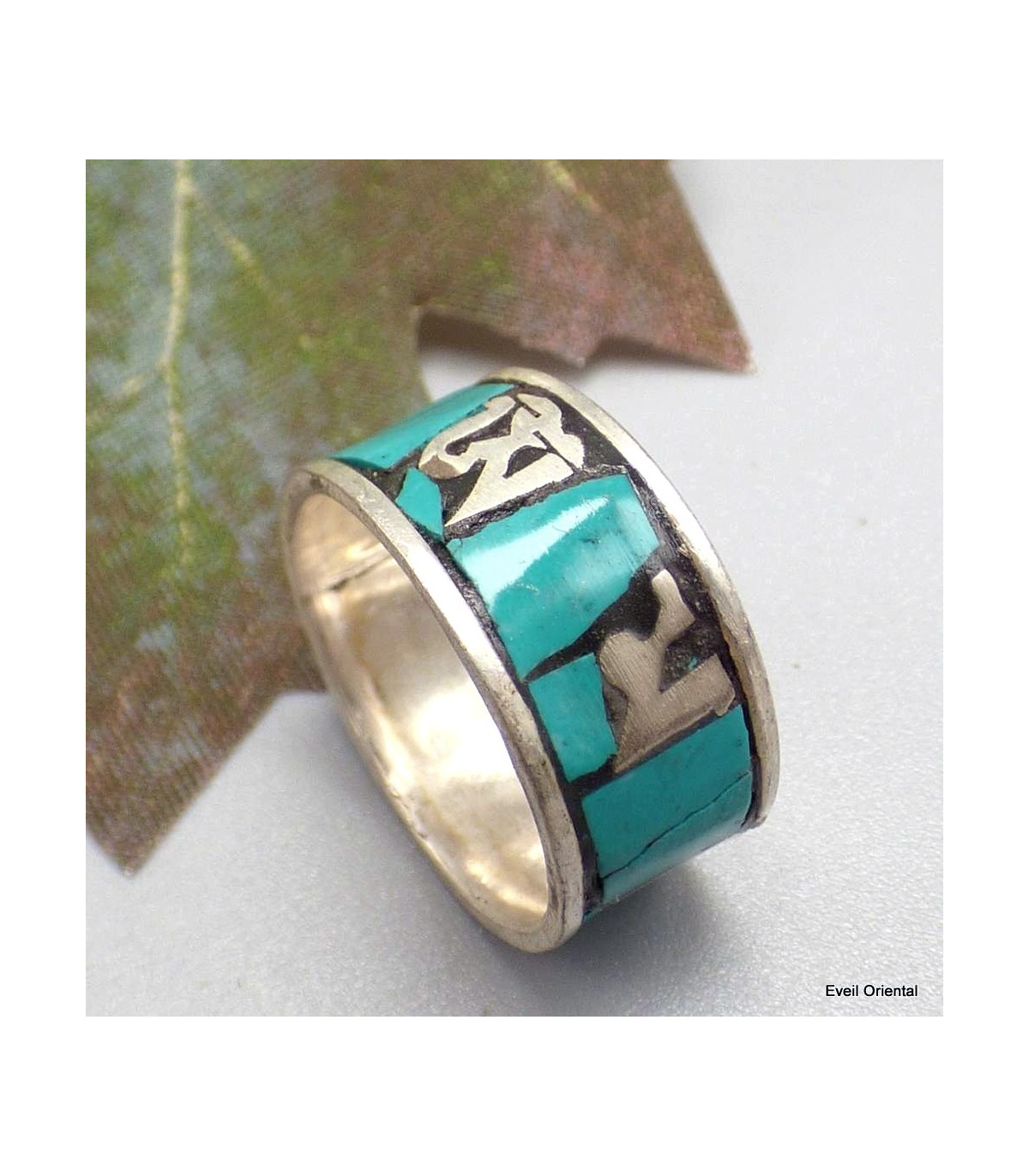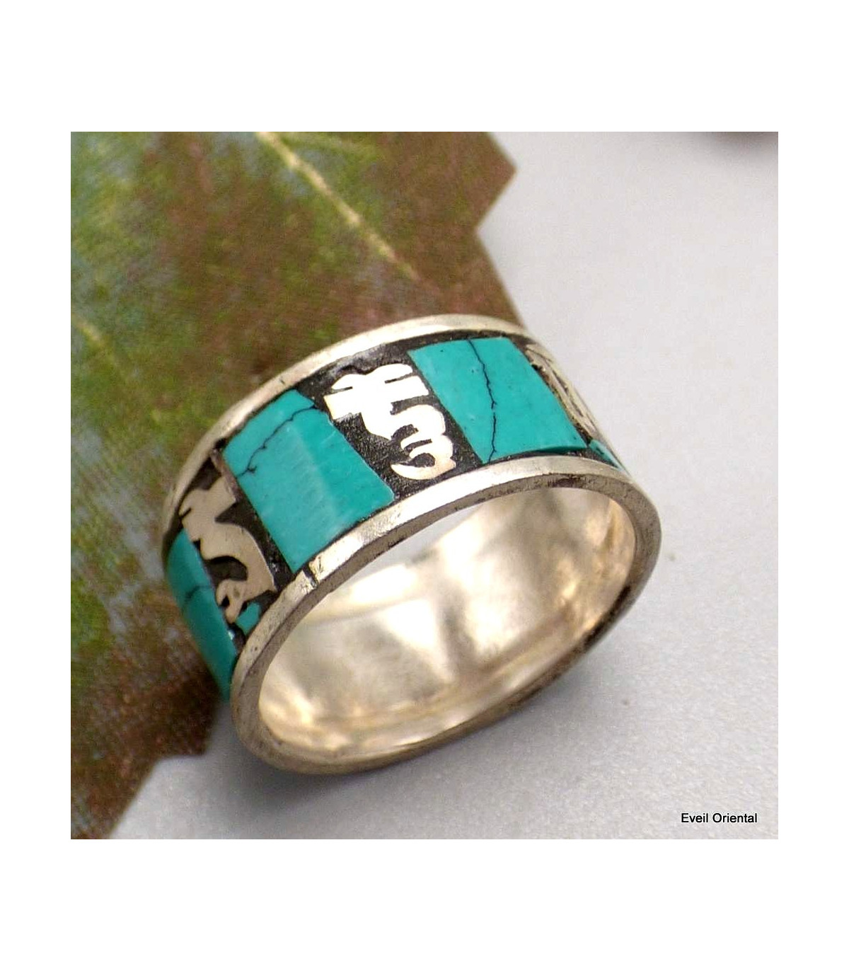 Bague tibétaine en turquoise – Mantra de Chenrezi, bijou bouddhiste sacré du Népal