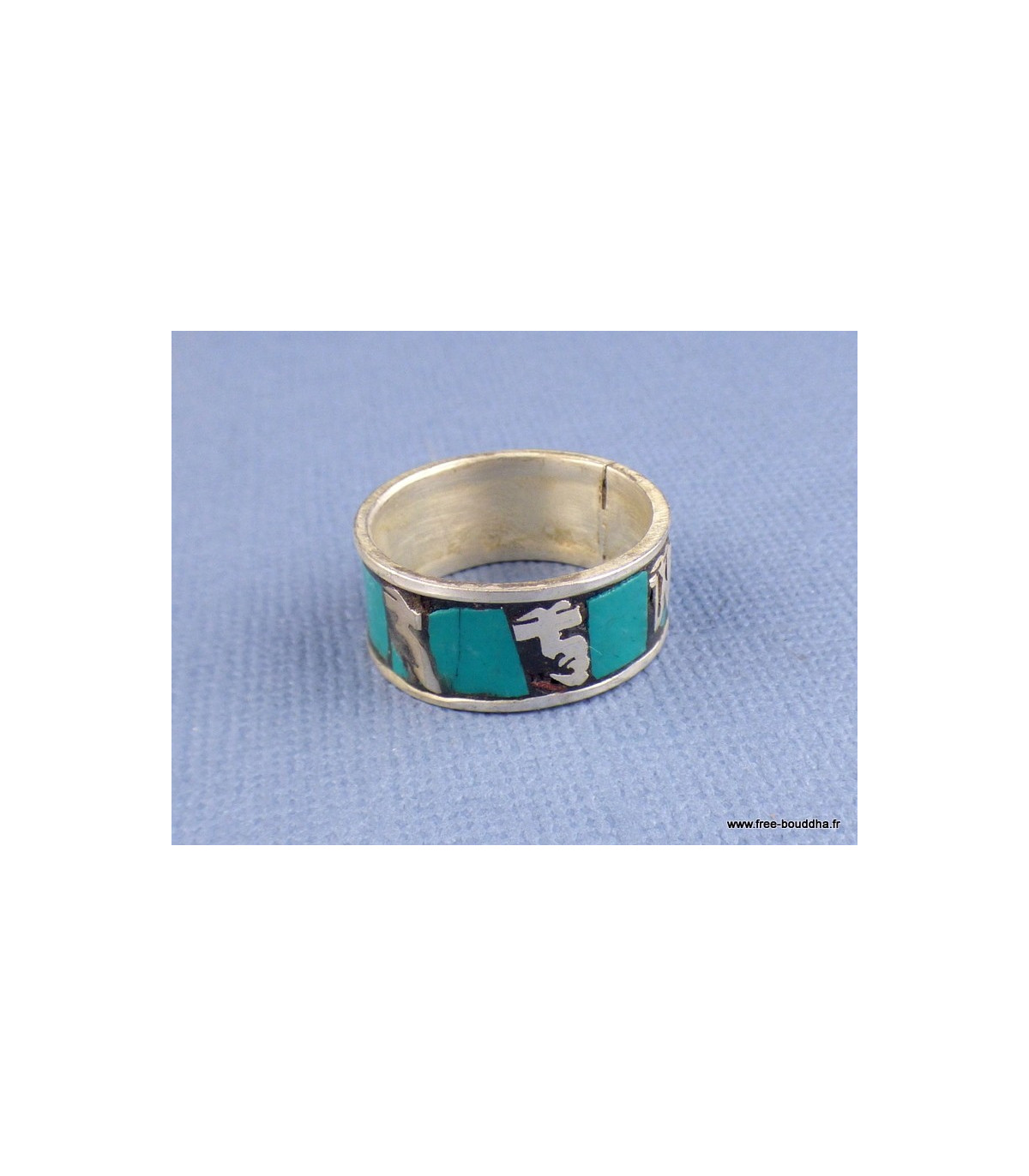 Bague turquoise Mantra de Chenrezi en métal et turquoise