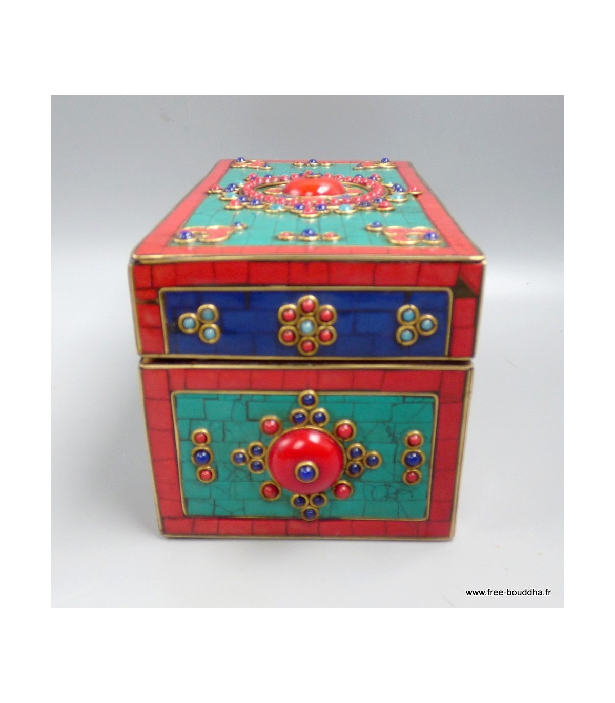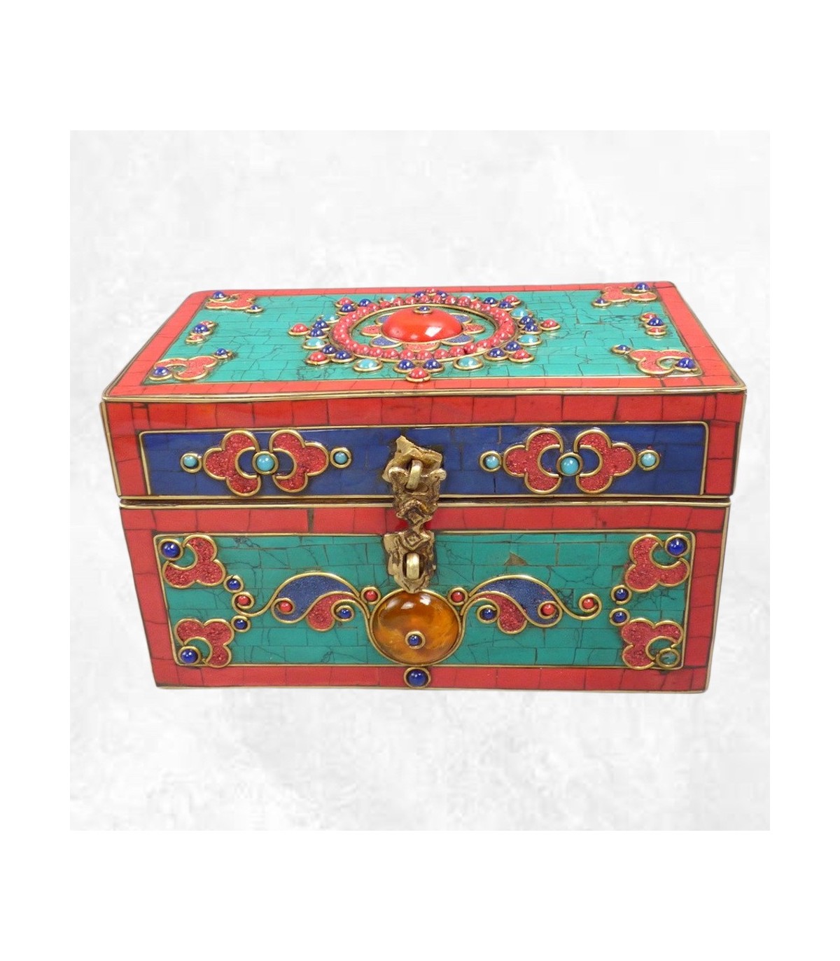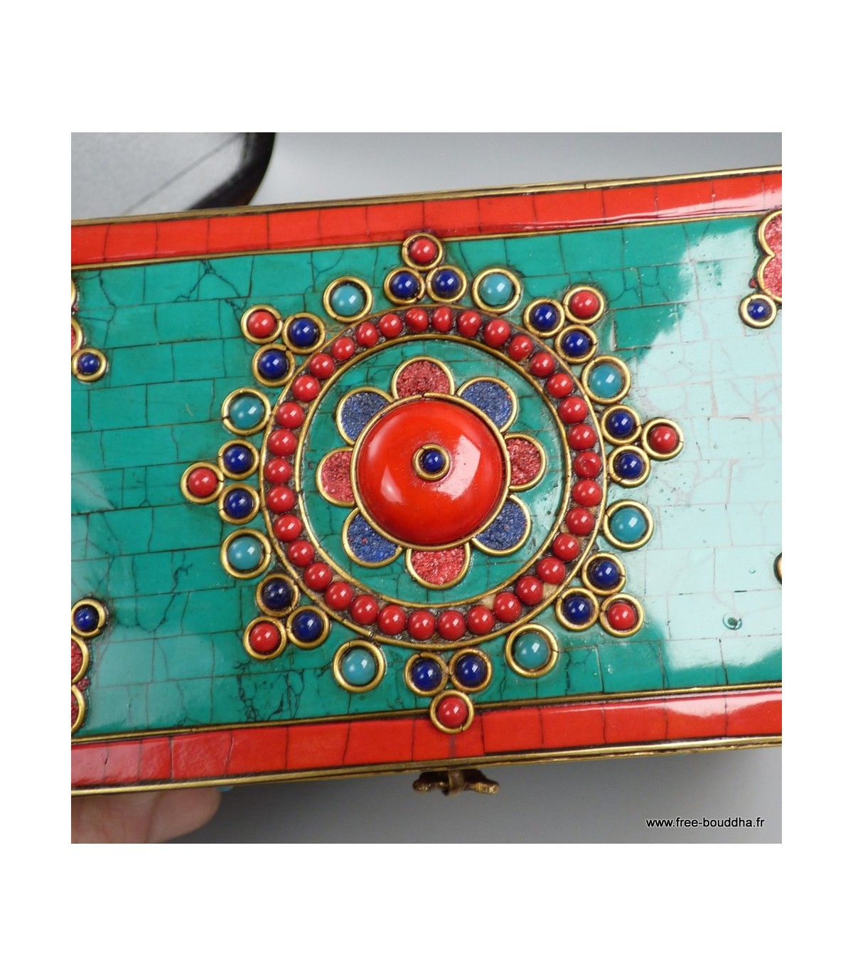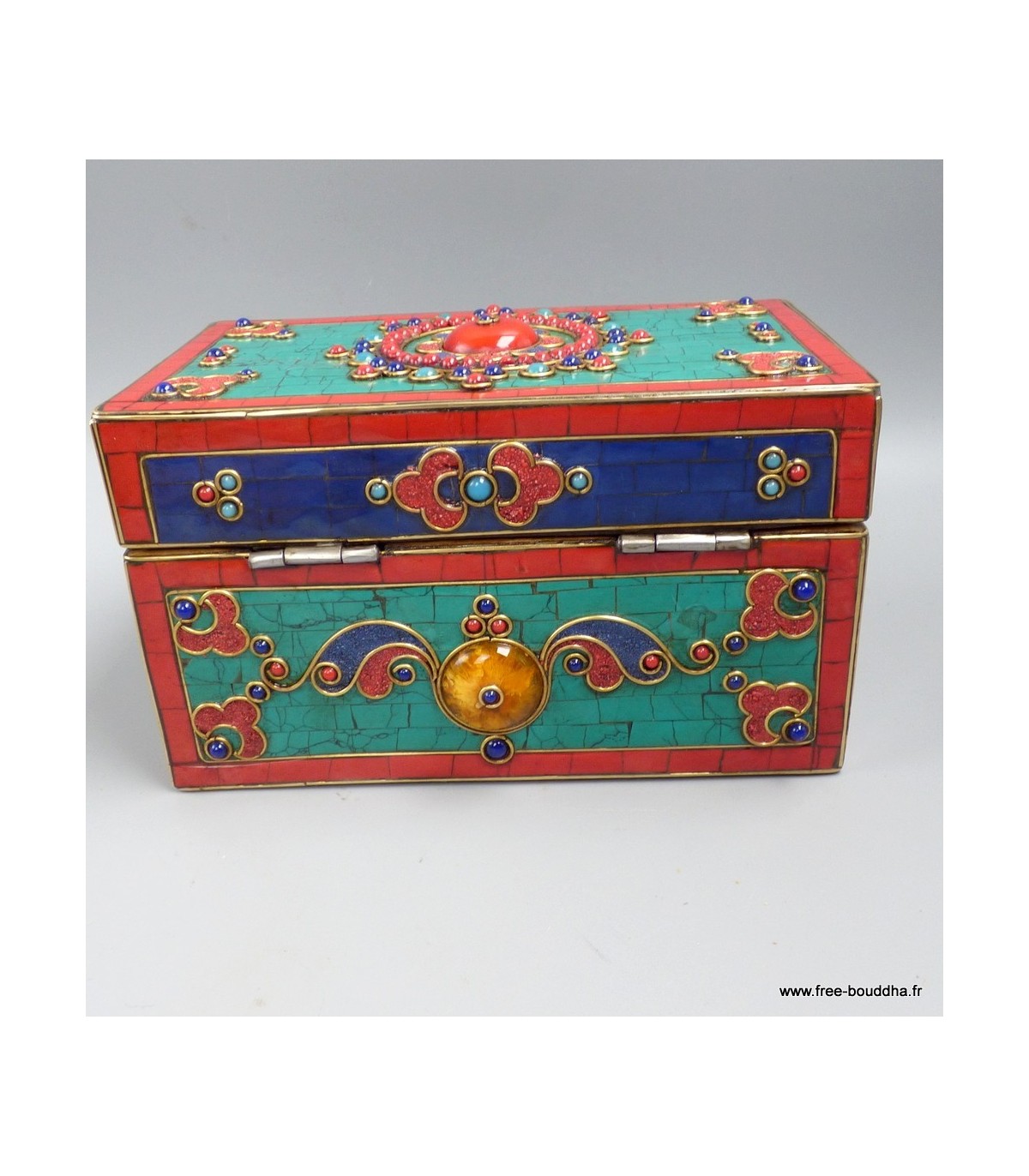 Boîte à bijoux tibétaine sertie de pierres naturelles Roue du Dharma