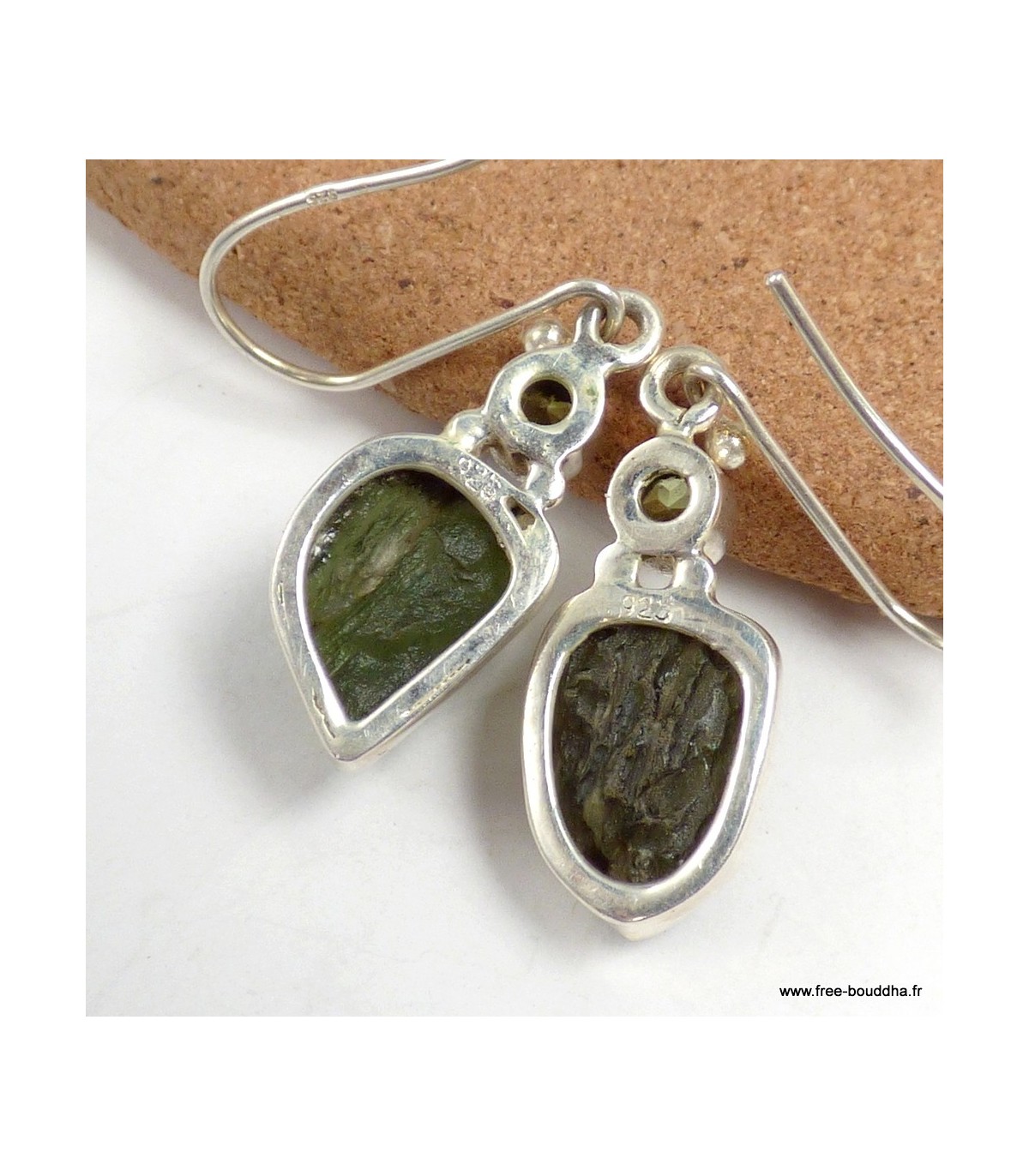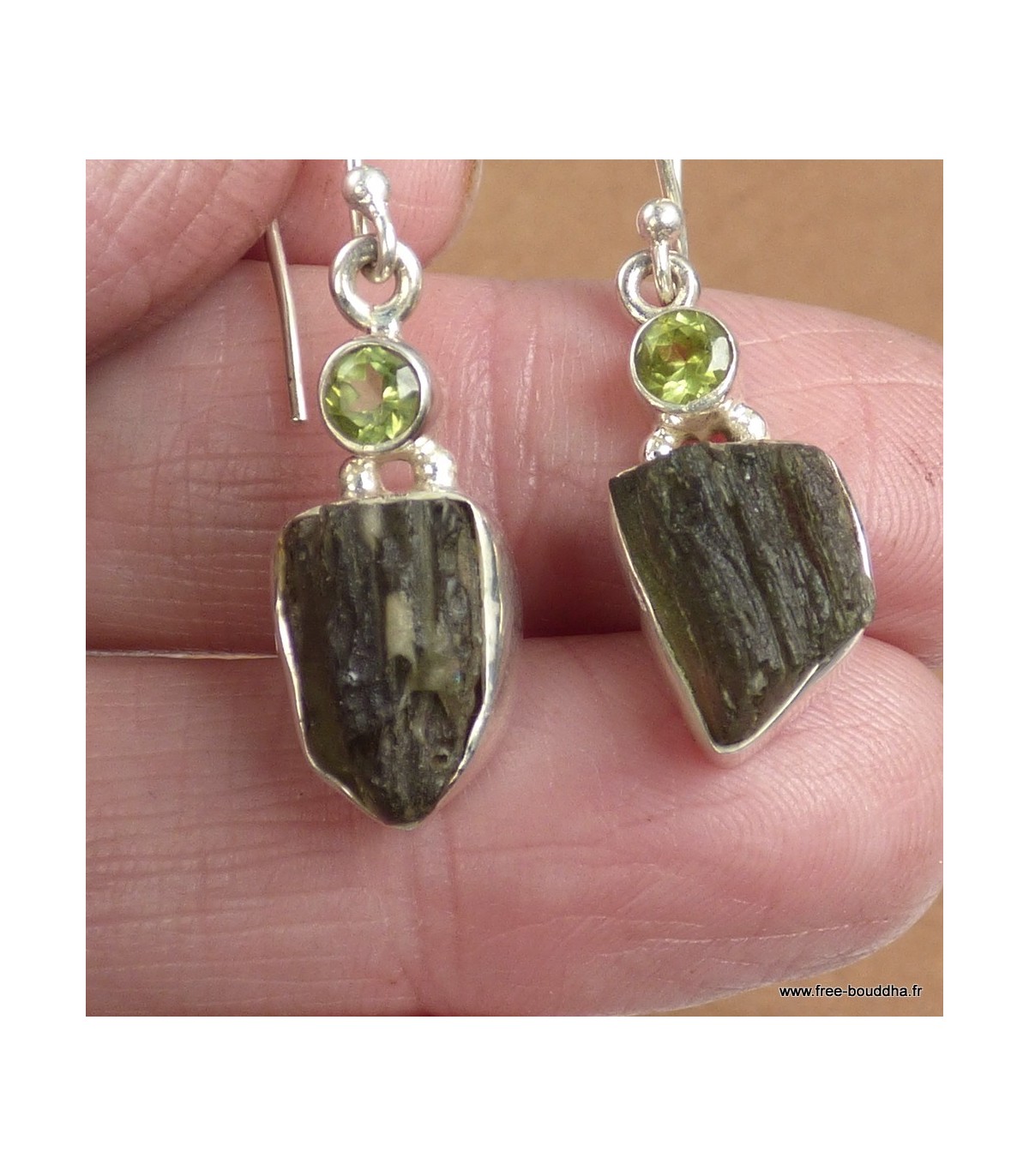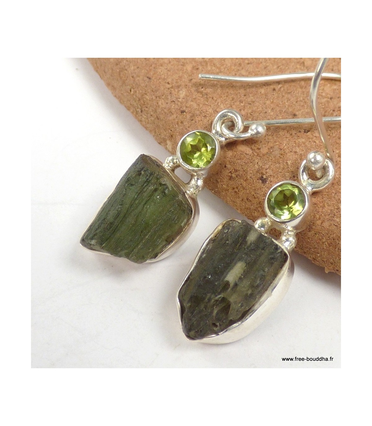 Boucles d’oreilles Moldavite brute & Péridot – Argent 925