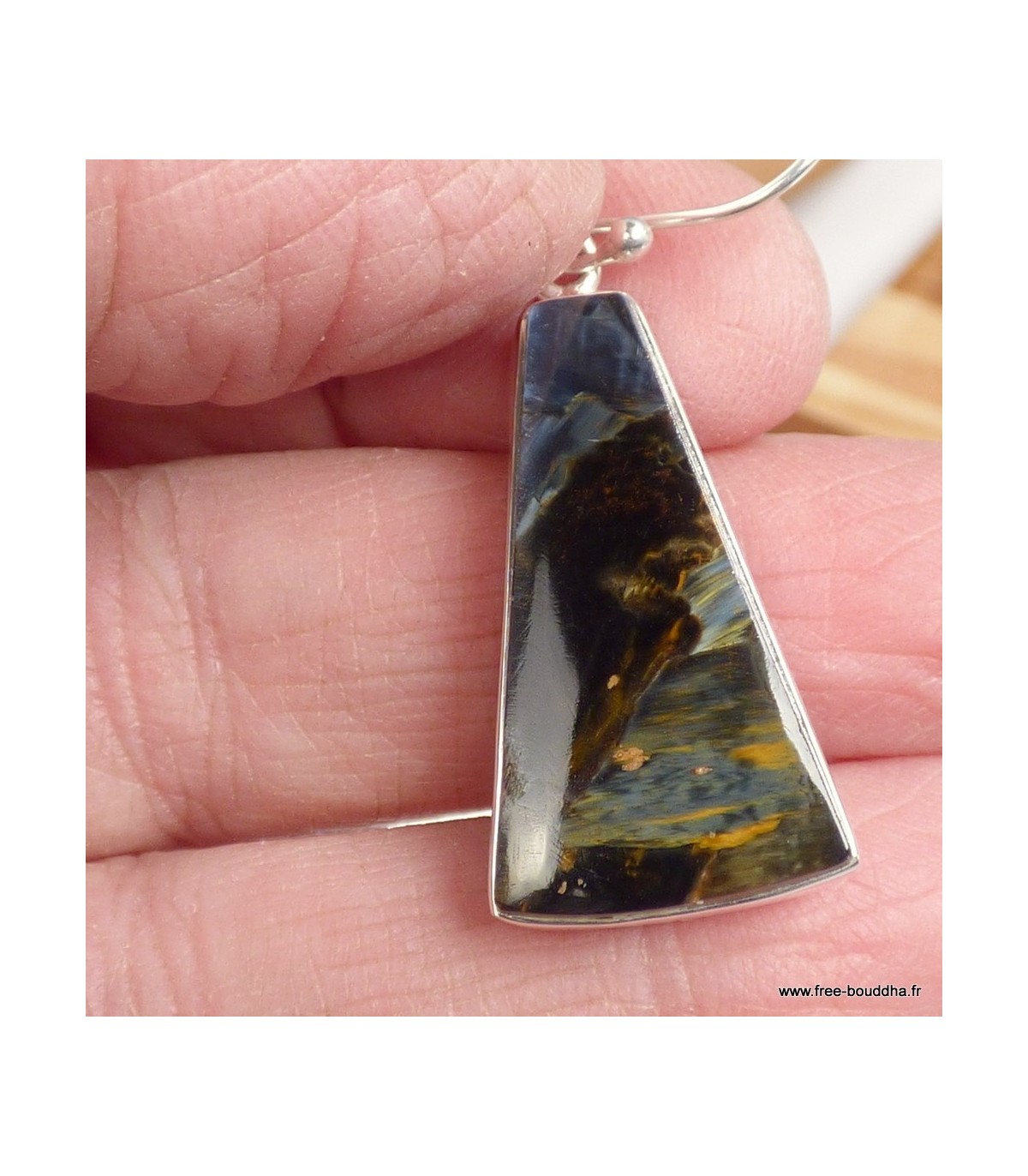 La Pietersite bleue, connue pour ses fibres chatoyantes qui semblent se déplacer sous la lumière, révèle ici toute sa force visuelle. La forme triangulaire renforce cette dynamique et apporte un caractère contemporain. L’argent 925 soutient l’ensemble avec sobriété et solidité.