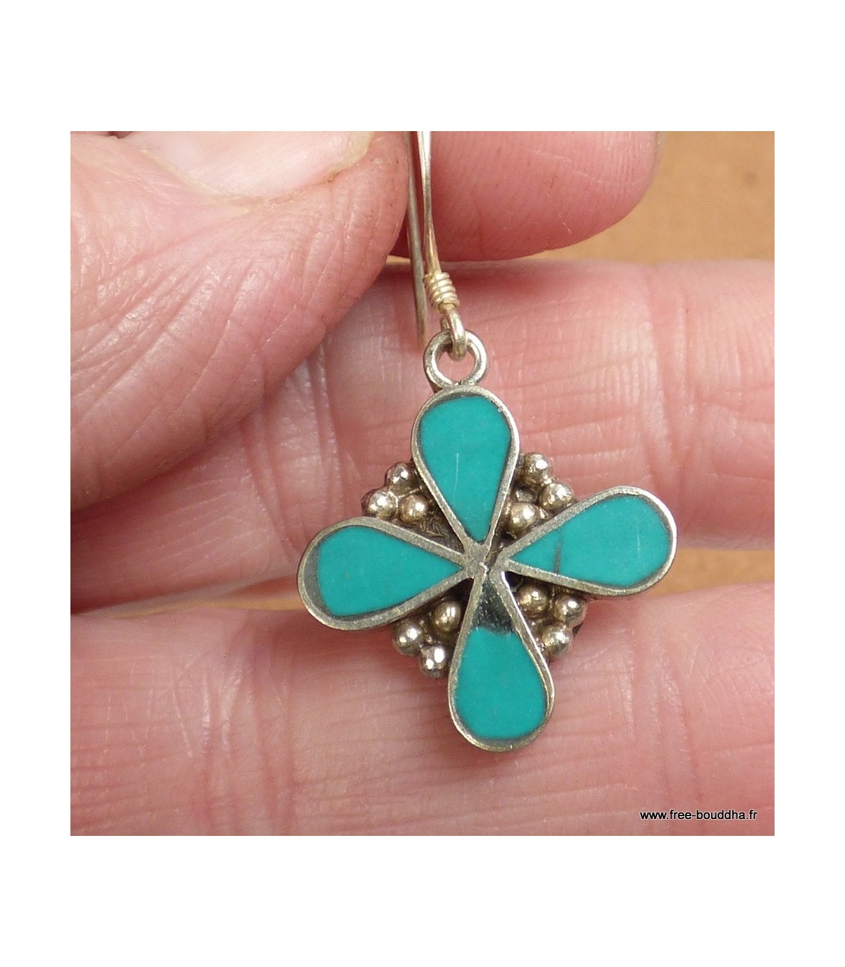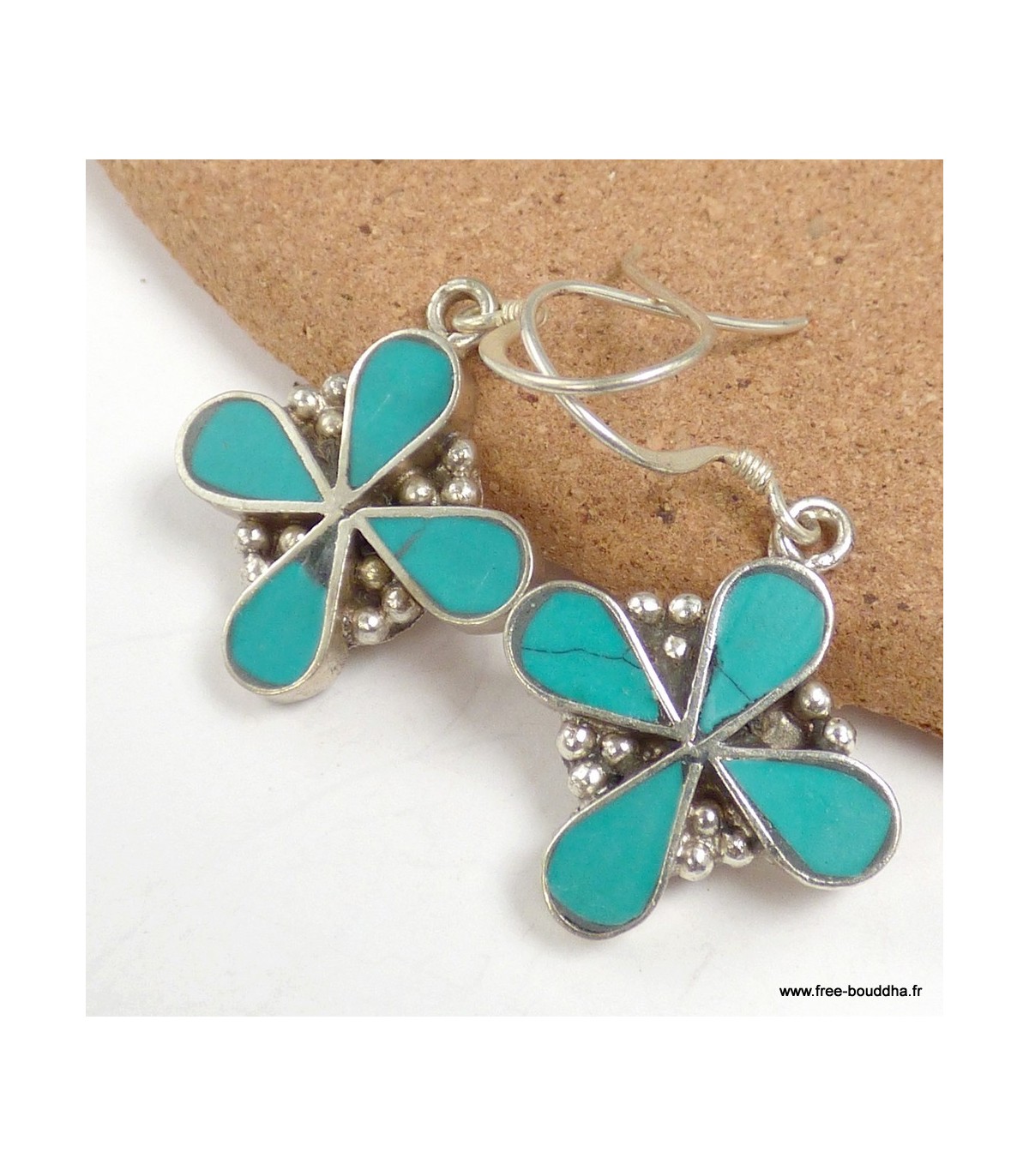 Boucles d’oreilles traditionnelles tibétaines 4 pétales en turquoise reconstituée
