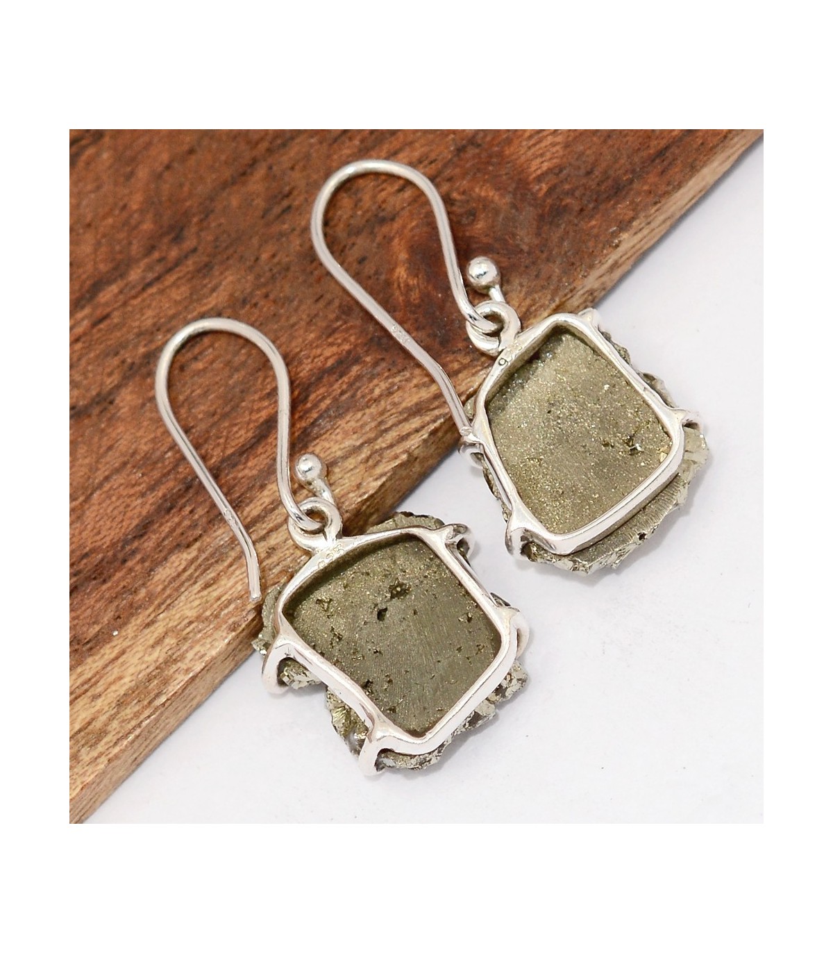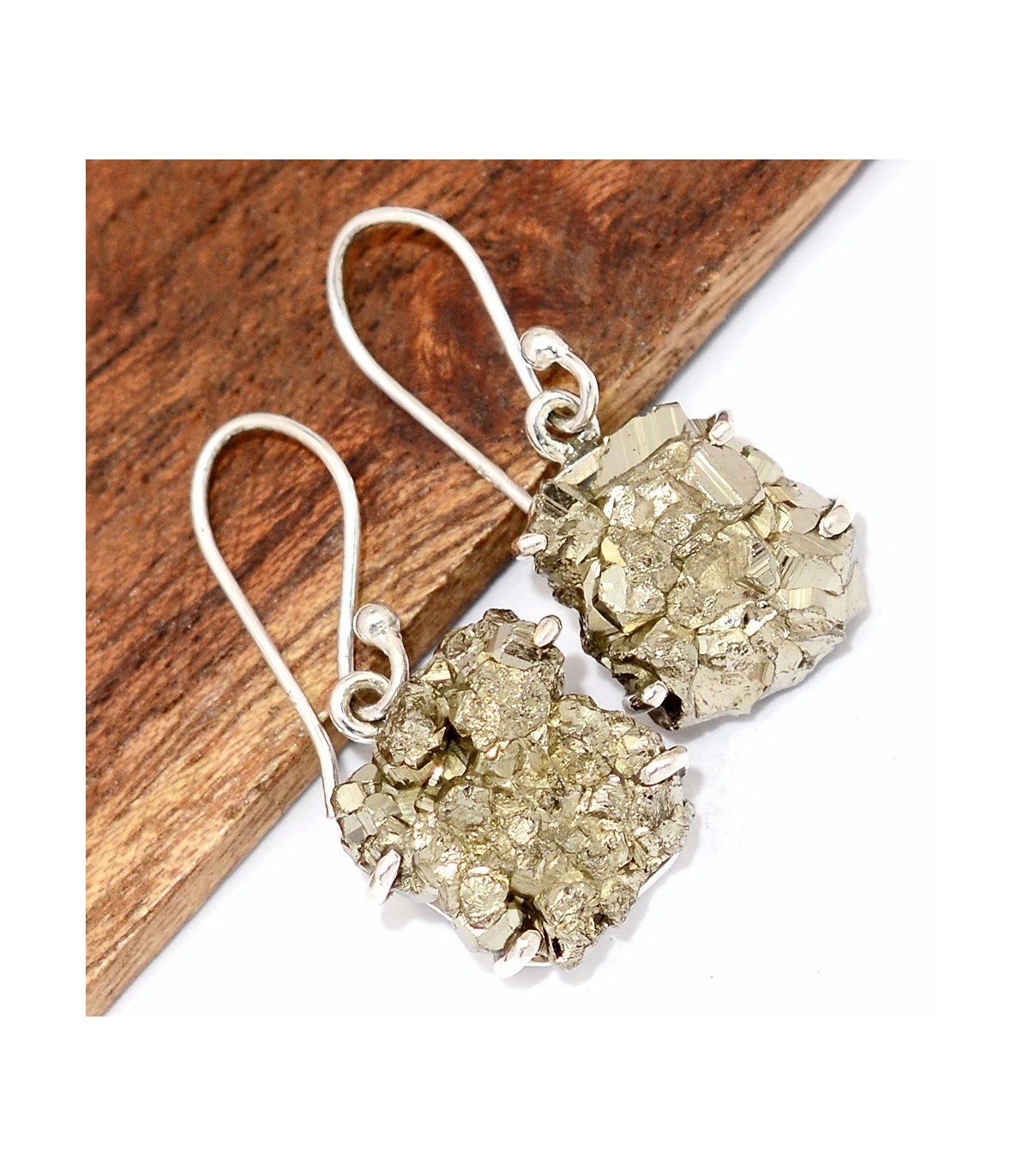 Boucles d’oreilles en Pyrite dorée authentique – Argent 925 – Sertissage griffes