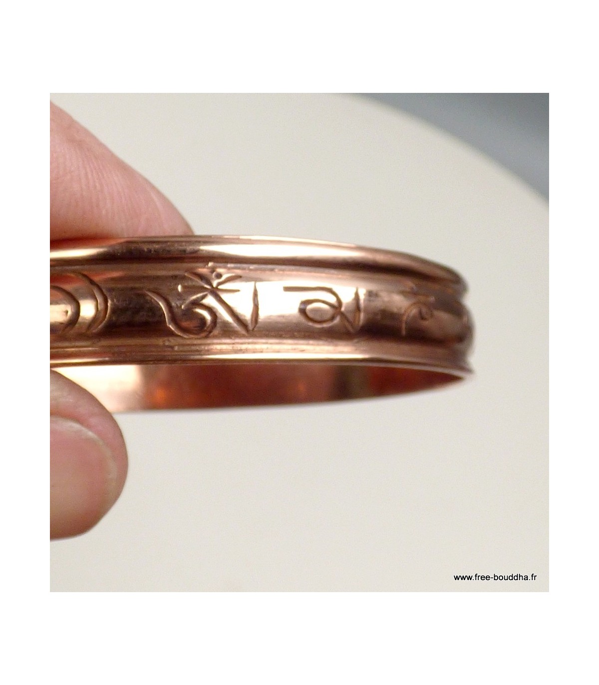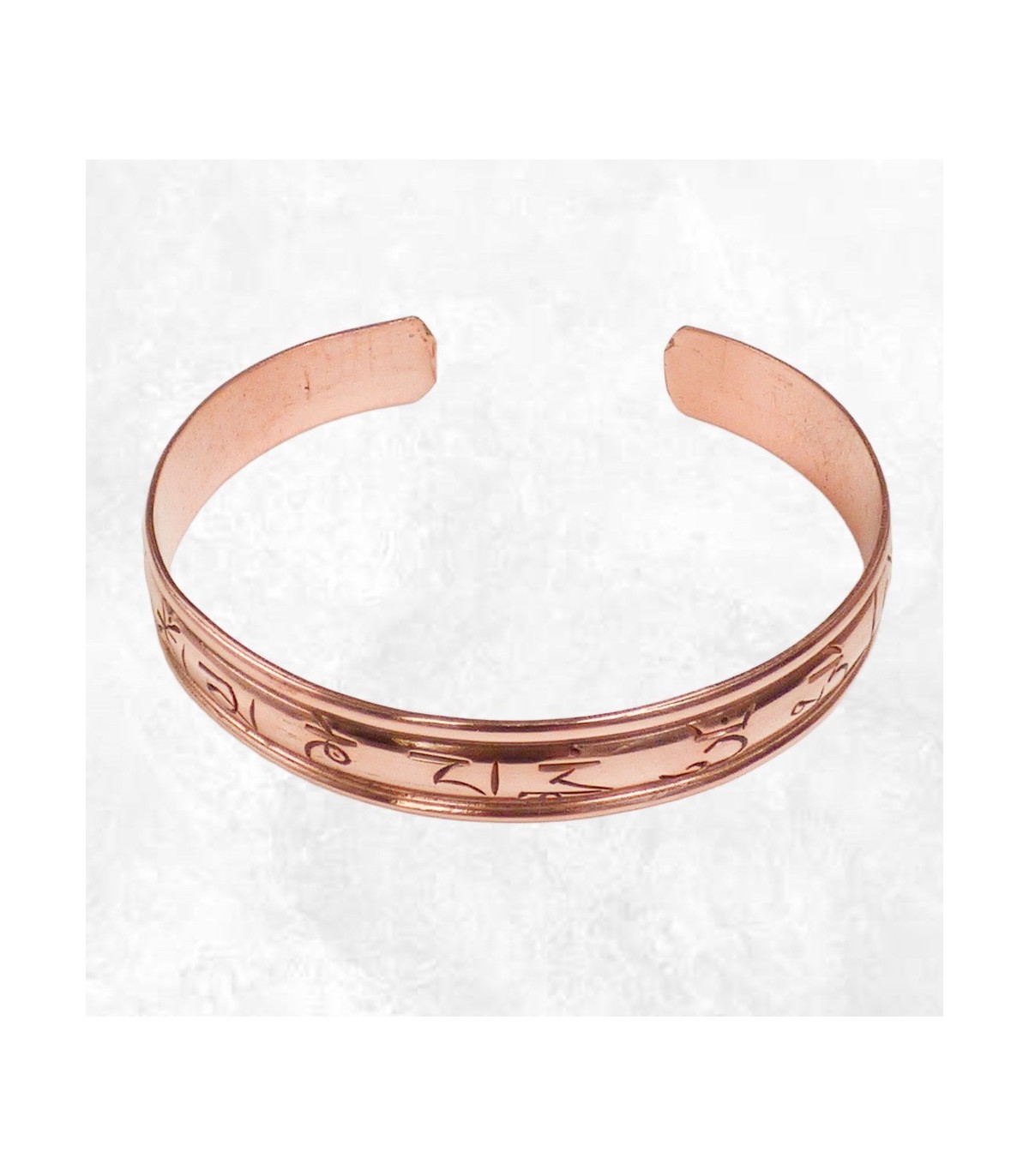 Ce bracelet bouddhiste en cuivre est décoré du mantra de Chenrezi, symbole de compassion et de bienveillance dans la tradition himalayenne. De chaque côté, un dorjé finement travaillé apporte protection et stabilité, renforçant la dimension spirituelle du bijou. Sa forme ouverte permet un ajustement naturel et confortable au poignet.