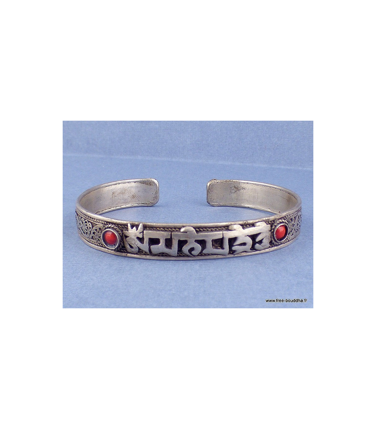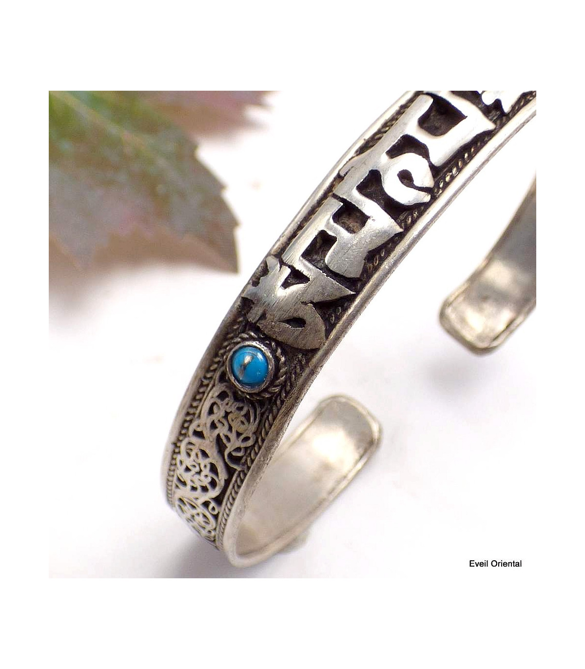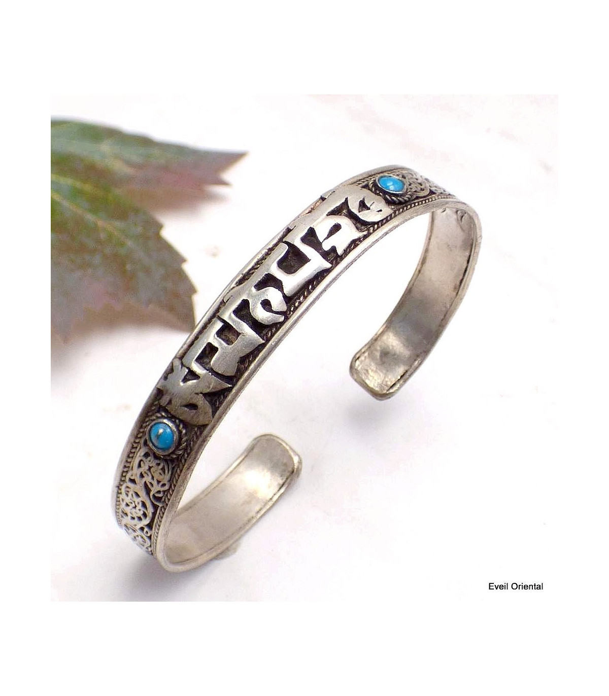 Ce bracelet finement travaillé est une création artisanale du Népal, conçu en métal blanc sans nickel, idéal pour les peaux sensibles. Il est orné du mantra sacré "Om Mani Padme Hum", dédié à Chenrezi, le bodhisattva de la compassion.