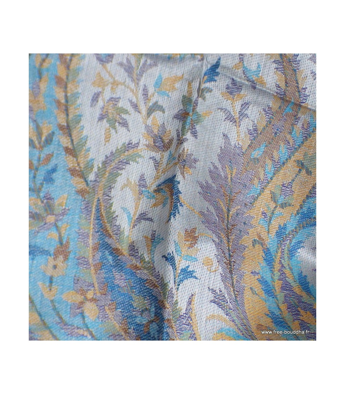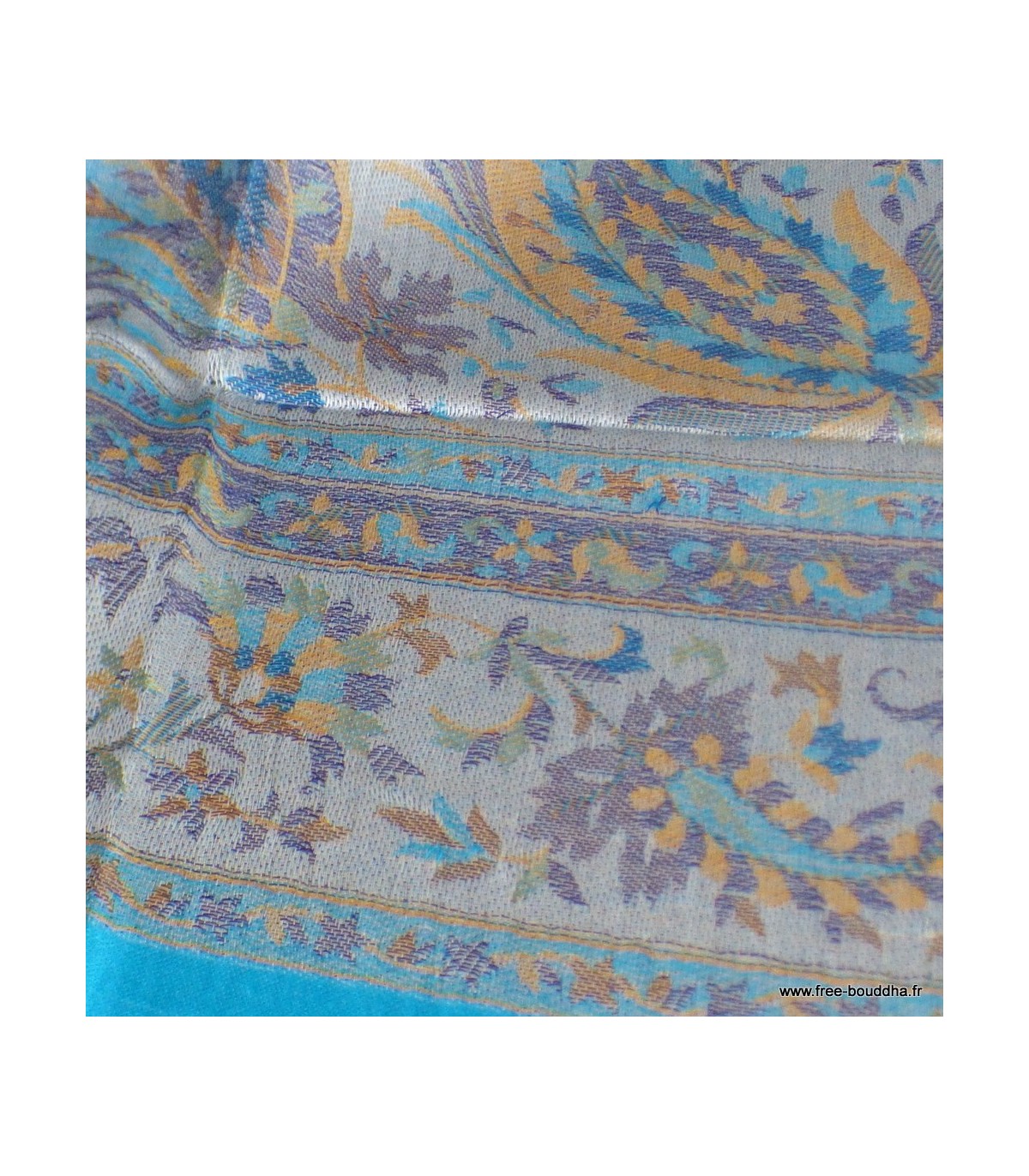 Ce châle en soie de bambou 100 % naturelle séduit par sa légèreté aérienne, son toucher soyeux et ses reflets bleu argent et turquoise, rehaussés de motifs floraux discrets. Sa fibre végétale offre un confort respirant, agréable à porter en toute saison, même sur les peaux sensibles.