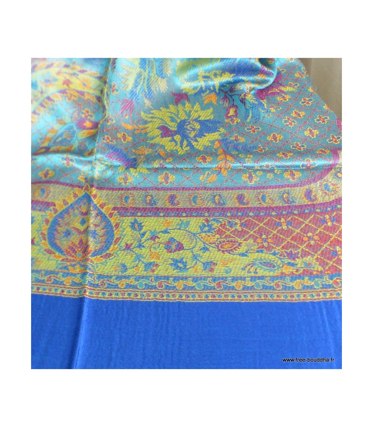 Ce châle en soie de bambou 100 % naturelle séduit par sa légèreté aérienne et son toucher soyeux. Ses reflets turquoise et rouille, subtilement mêlés à des nuances bleu argent, sont rehaussés de motifs floraux discrets qui apportent une élégance raffinée. Sa fibre végétale offre un confort respirant, agréable à porter en toute saison, même sur les peaux sensibles.