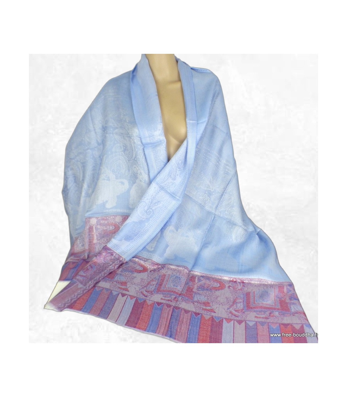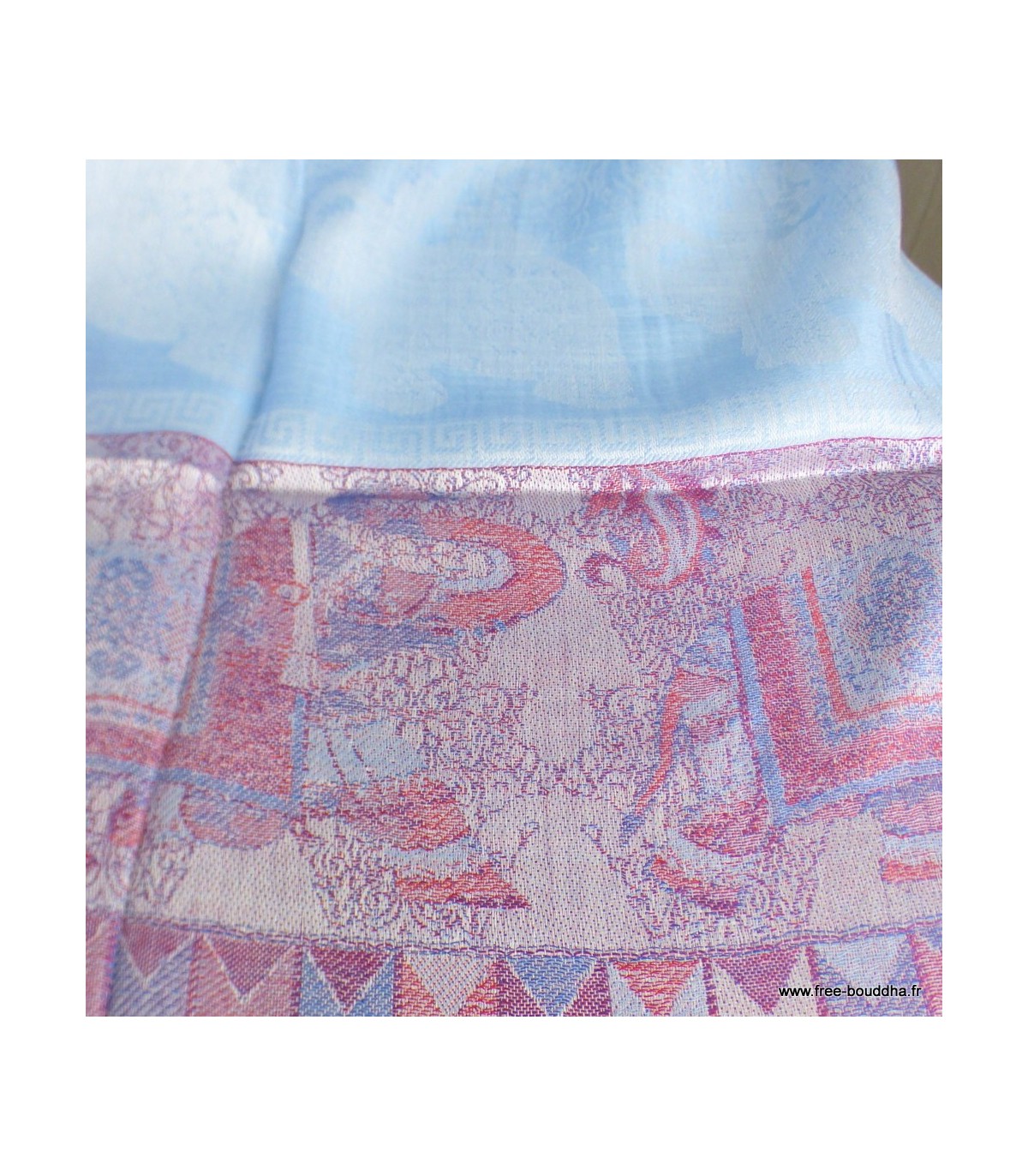 Élégant et raffiné, ce châle en soie de bambou 100 % naturelle séduit par sa légèreté aérienne et son toucher soyeux. Ses nuances argentées sur fond bleu clair et prune sont rehaussées de motifs ethniques délicats qui apportent une touche intemporelle à vos tenues.
