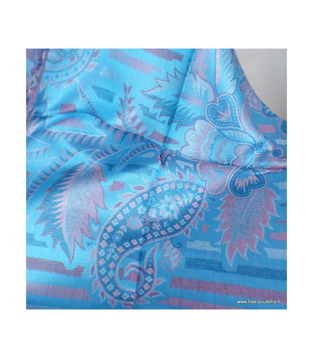 Ce châle en soie de bambou 100 % naturelle séduit par sa légèreté, son toucher fluide et ses reflets turquoise et rose délicatement fleuris. Sa matière végétale offre un confort respirant et une sensation agréable sur la peau, même sensible.