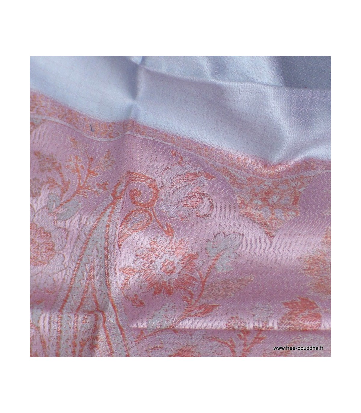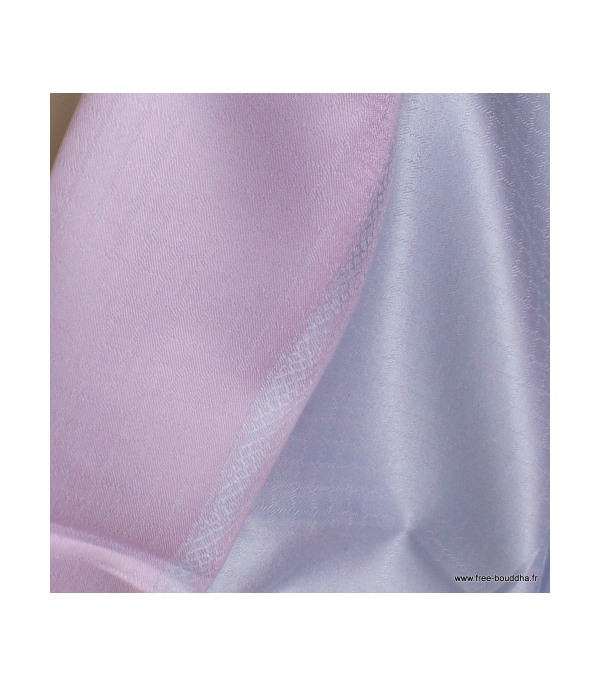 Le tissage moiré de la soie de mûrier révèle des nuances subtiles qui évoluent selon l’orientation de la lumière. Le rose poudré et le gris bleuté se répondent avec délicatesse, créant un contraste doux et raffiné.
