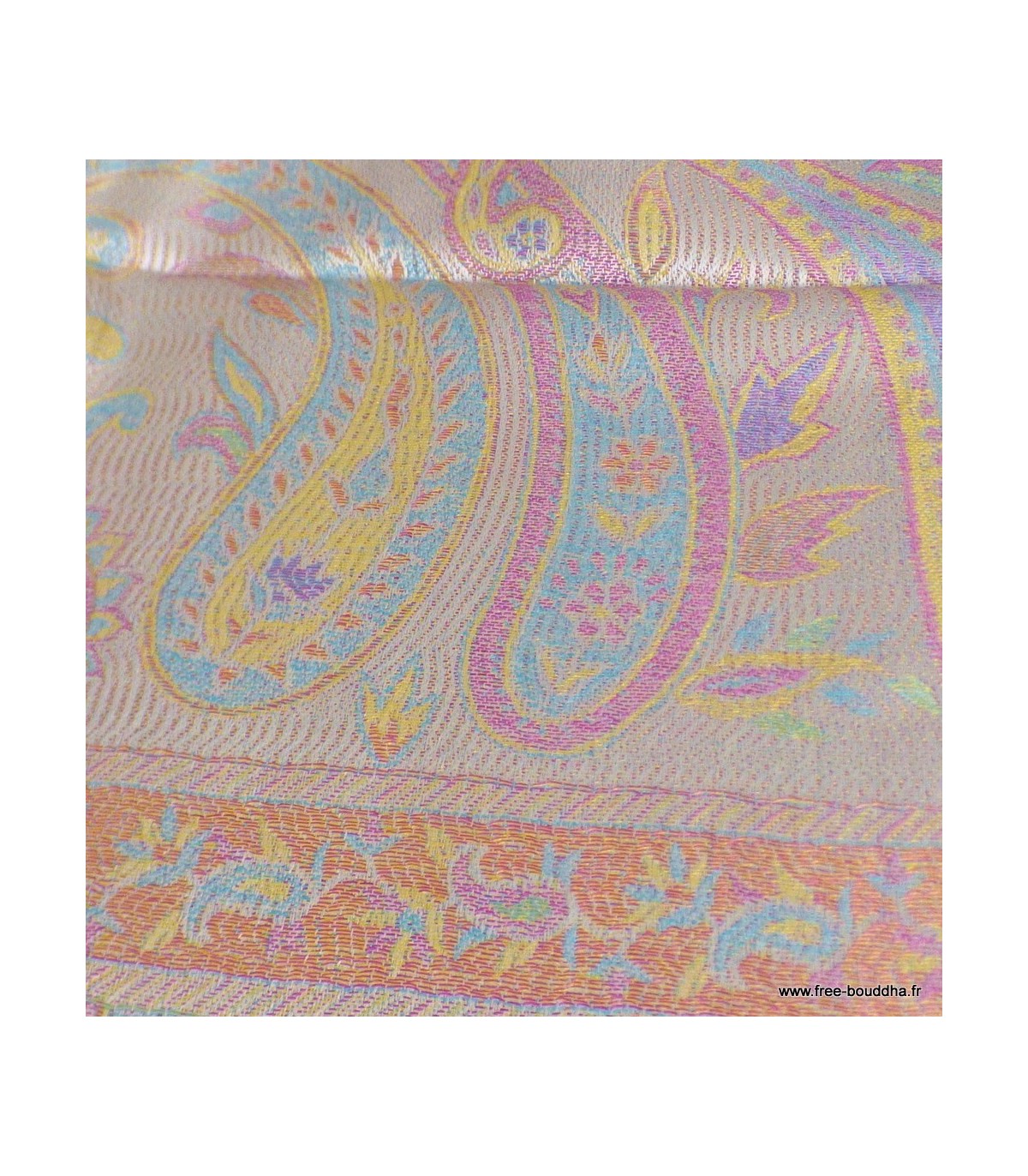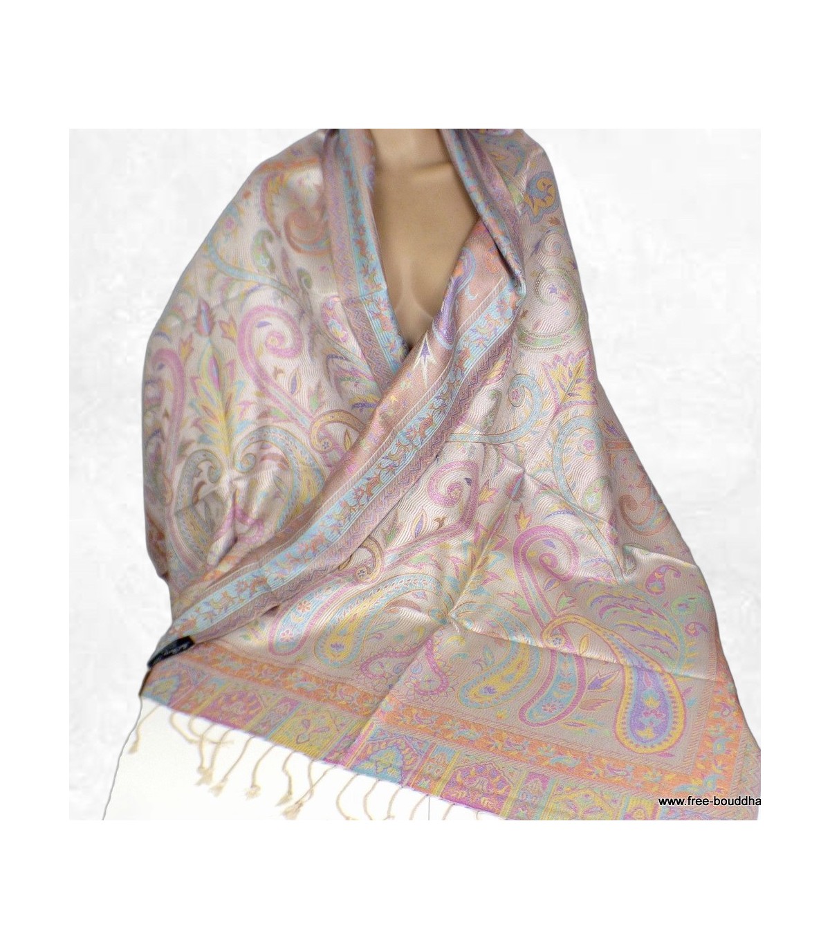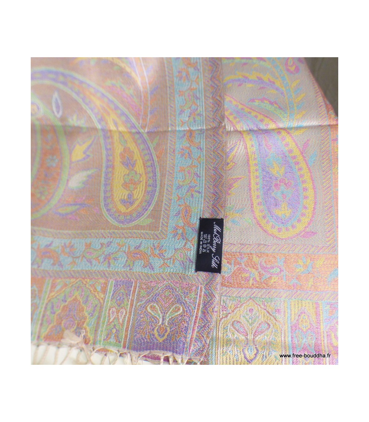 Cette étole pour femme en soie de mûrier incarne l’alliance subtile entre raffinement textile et confort haut de gamme. Sa teinte argentée aux nuances rosées est sublimée par un tissage moiré aux reflets changeants, révélant des tonalités multicolores chaleureuses. Les motifs cachemire, aux accents cuivrés et dorés, ajoutent une touche d’élégance artisanale. Légère, fluide et agréable à porter, elle accompagne aussi bien les tenues habillées que les instants du quotidien.