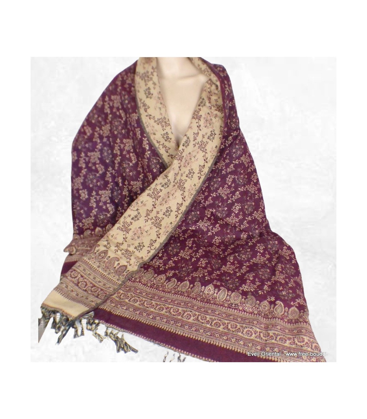 Châle népalais couleur prune à motifs feuilles 100 x 200 cm – Fabriqué au Népal