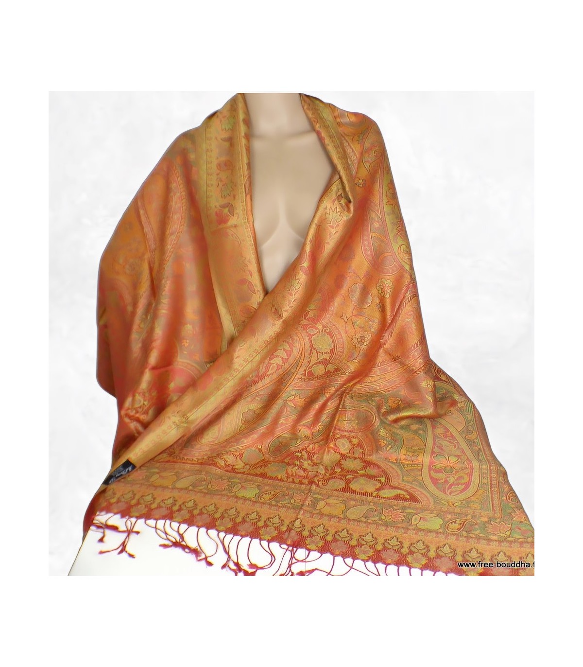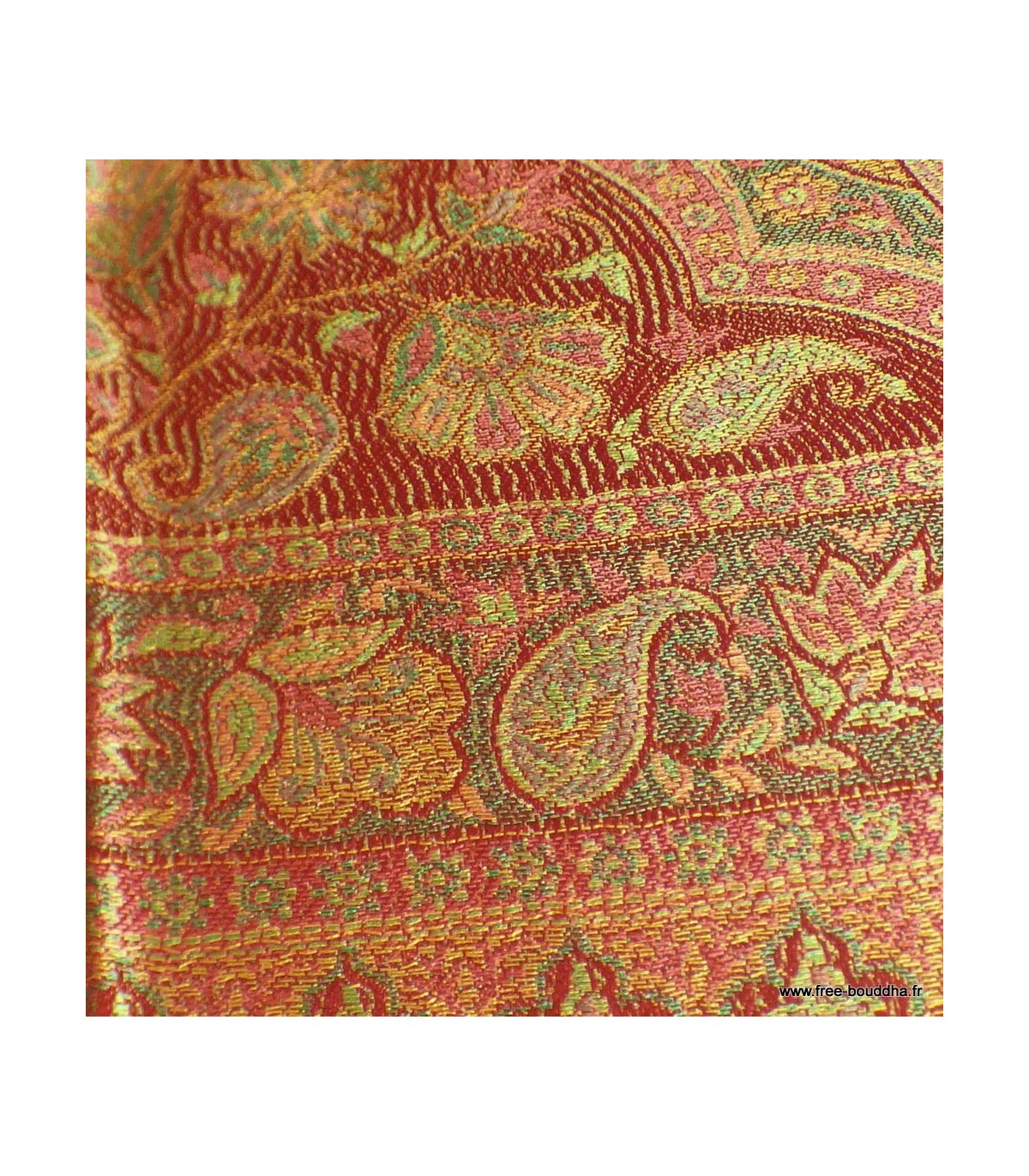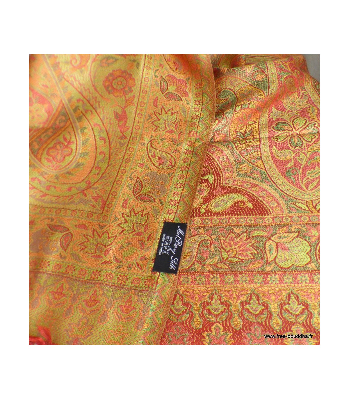 Ce châle pour femme en soie de mûrier incarne l’alliance subtile entre raffinement textile et confort haut de gamme. Sa teinte rouge or, enrichie de nuances anis et vertes, crée une impression lumineuse proche de l’or grâce à son tissage moiré aux reflets changeants. Les motifs cachemire multicolores, aux accents cuivrés et chaleureux, ajoutent une touche d’élégance artisanale. Léger, fluide et agréable à porter, il accompagne aussi bien les tenues habillées que les instants du quotidien.