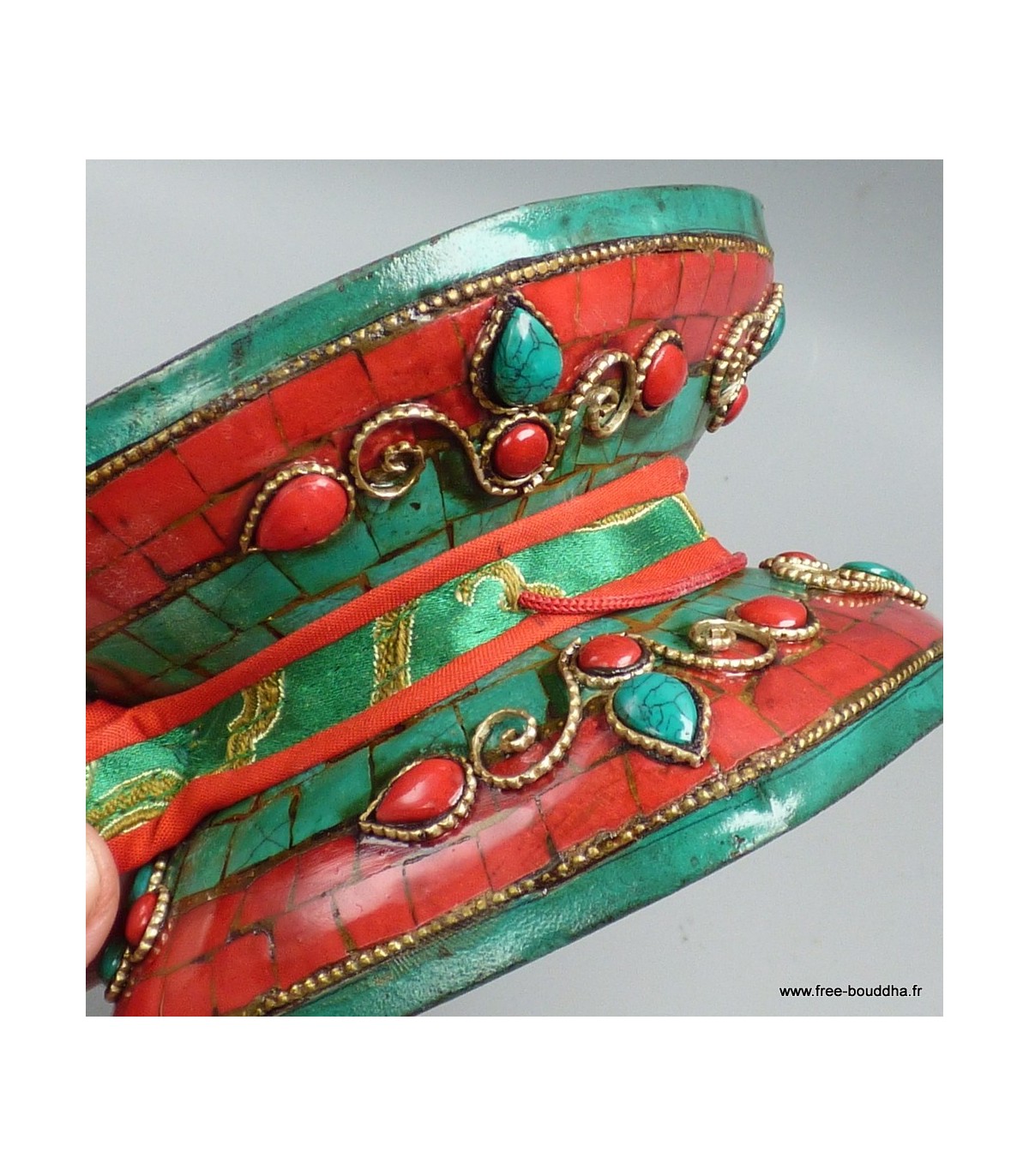 Ce damaru tibétain est réalisé de manière artisanale et orné d’un mélange de pierres naturelles et de pierres fantaisie, accompagnées d’un décor filigrané minutieux. Son format compact le rend très agréable à utiliser lors des rituels bouddhistes, des pratiques méditatives ou des cérémonies. La couleur de la lanière peut varier selon les arrivages, ce qui confère à chaque pièce son caractère propre. Le damaru est livré sans pochette.
