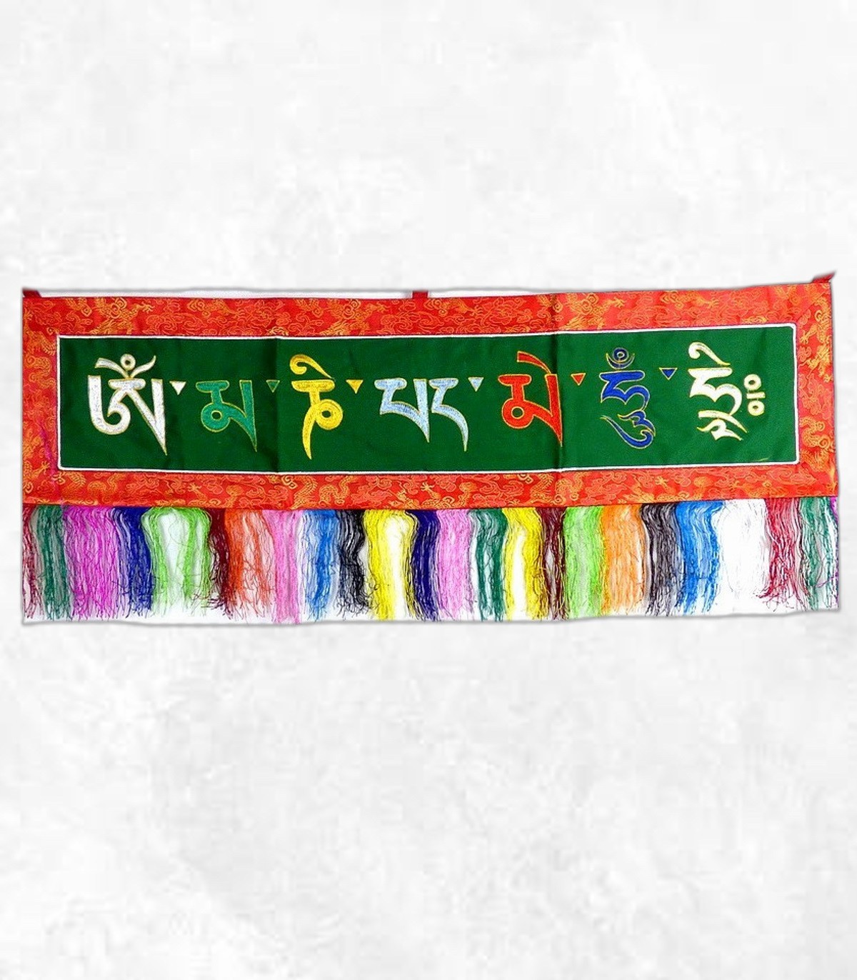 Ce dessus de porte tibétain est une tenture traditionnelle que l’on fixe au-dessus d’une ouverture (porte ou fenêtre). Elle est brodée du mantra sacré Om Mani Pedme Hung, associé à Chenrezi, le Bodhisattva de la Grande Compassion. Réalisée en coton doublé, avec un arrière rouge, elle est fabriquée artisanalement au Népal et peut comporter de légères irrégularités, témoins de son authenticité.