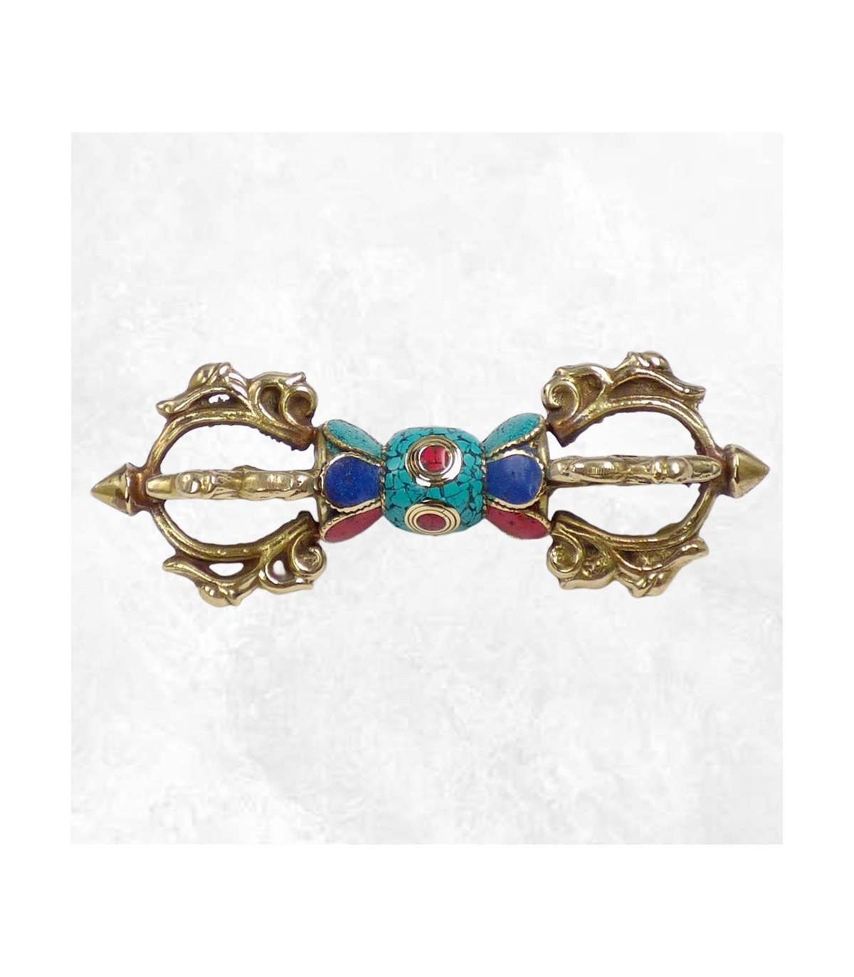 Le dorjé à quatre branches symbolise l’équilibre des forces, la stabilité intérieure et l’indestructibilité de l’esprit éveillé. Les pierres qui l’ornent ajoutent une dimension vibratoire et colorée, renforçant son énergie et sa présence rituelle. Ce type de dorjé est particulièrement apprécié pour soutenir la méditation, la purification et les pratiques tantriques.