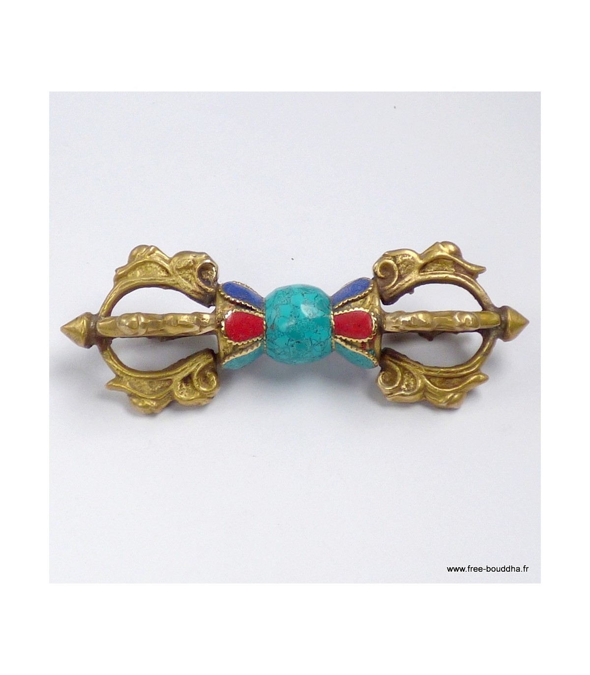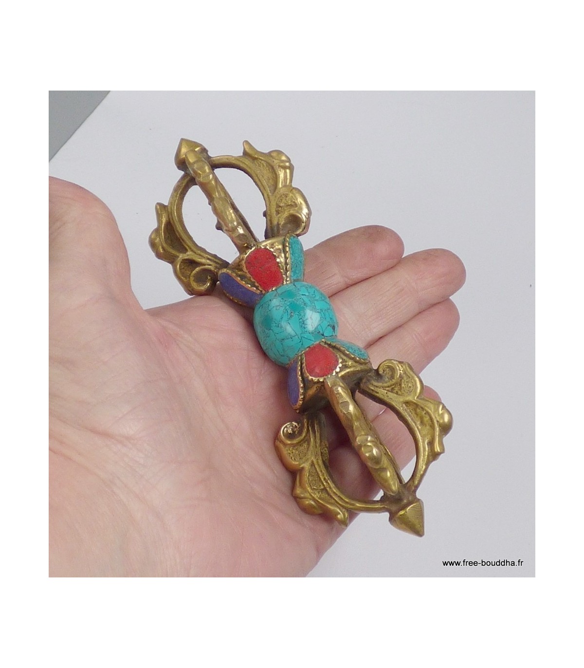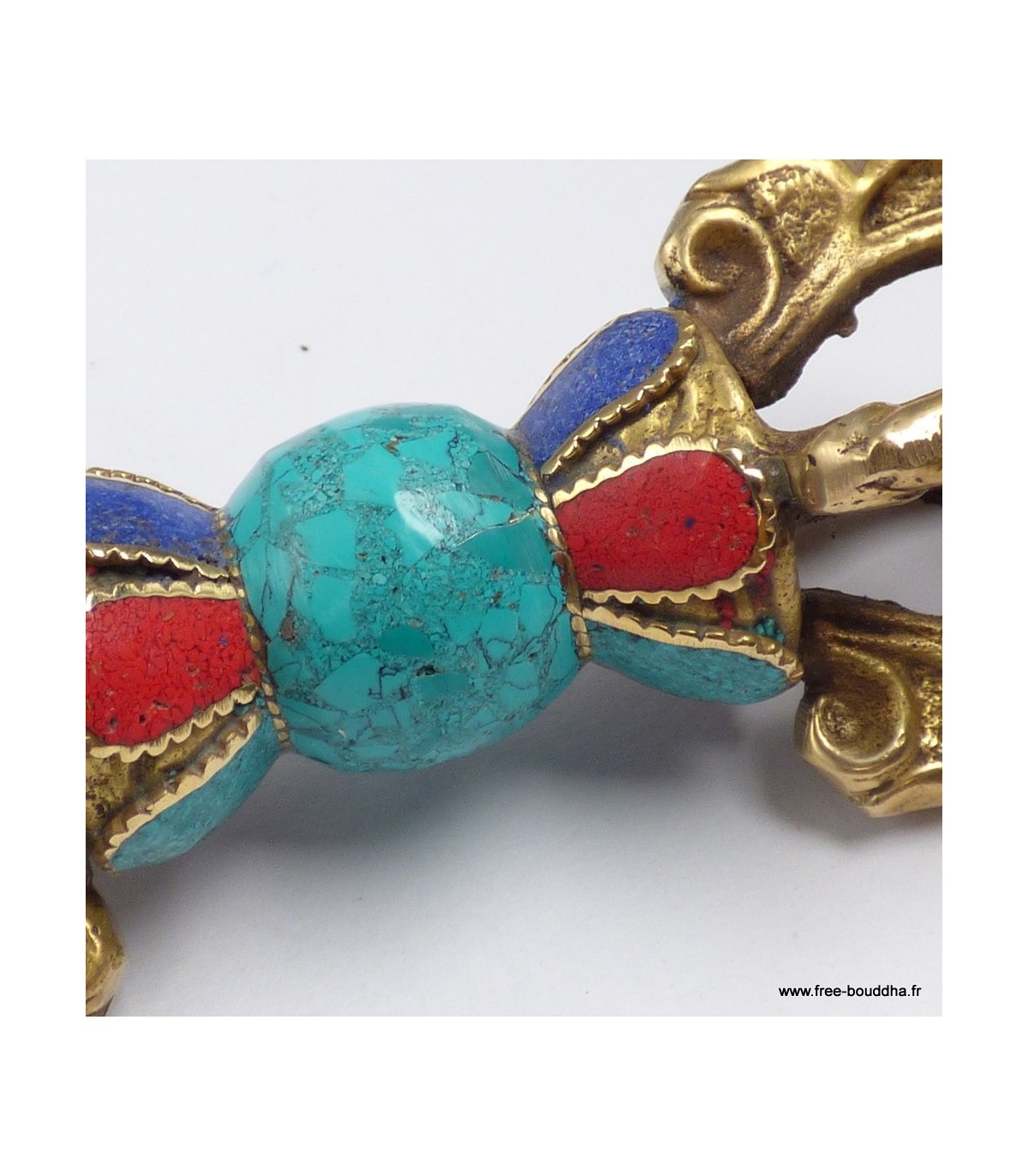 Dorje vajra tibétain 4 branches serti de pierres naturelles 13,5 cm
