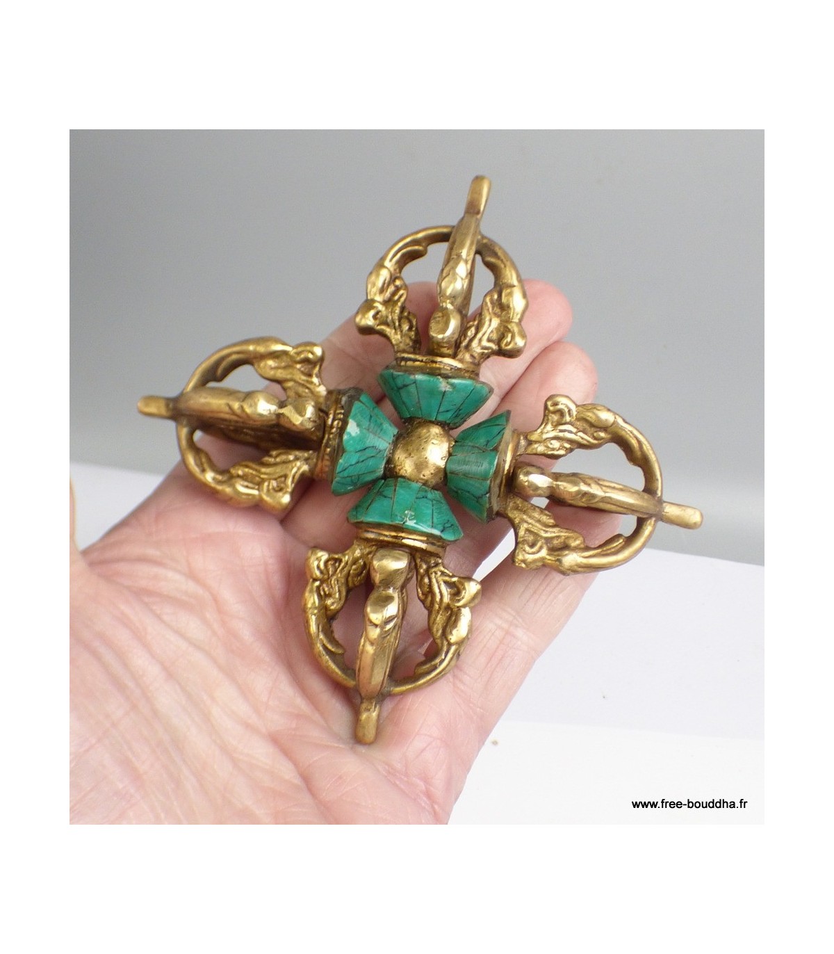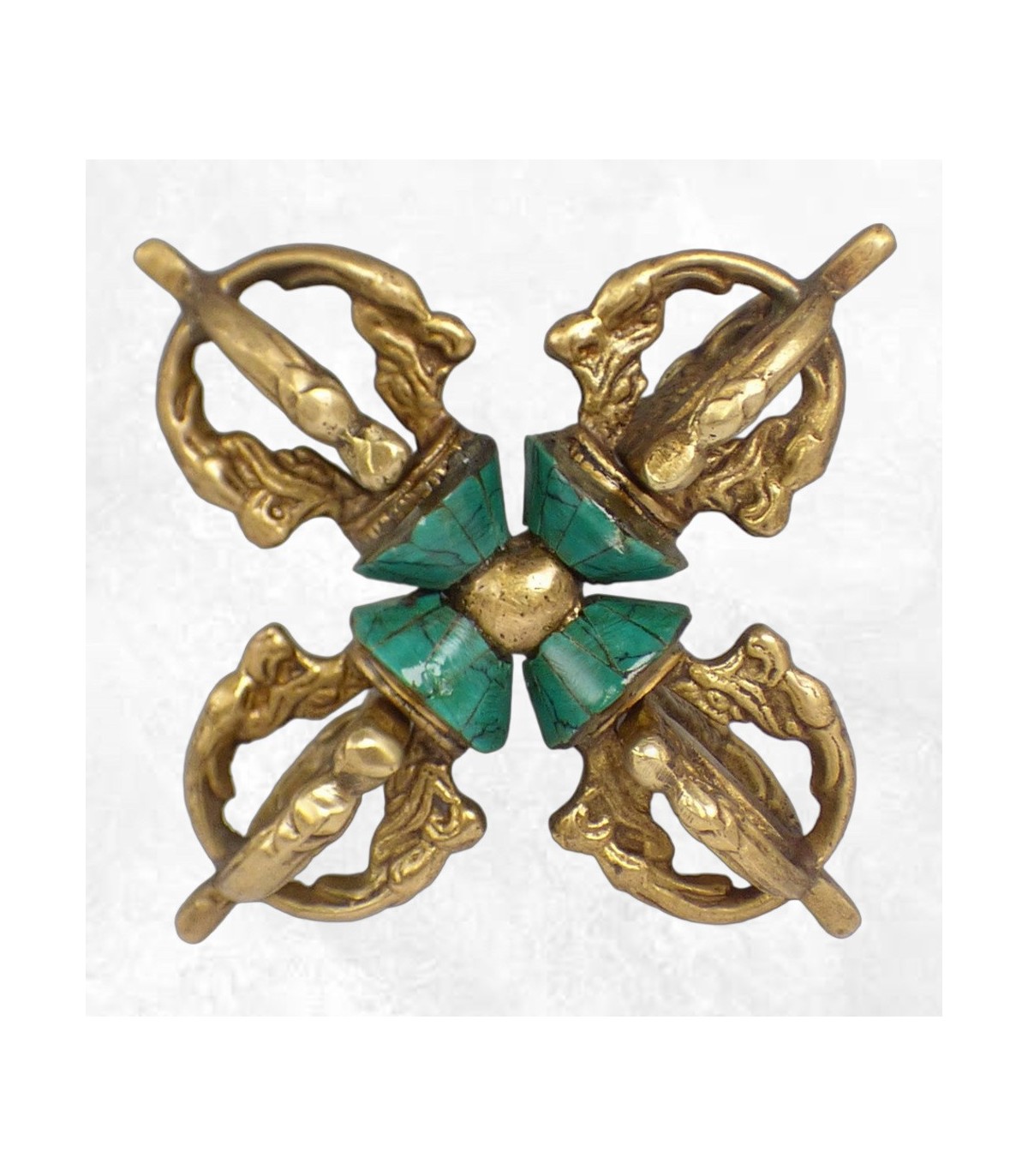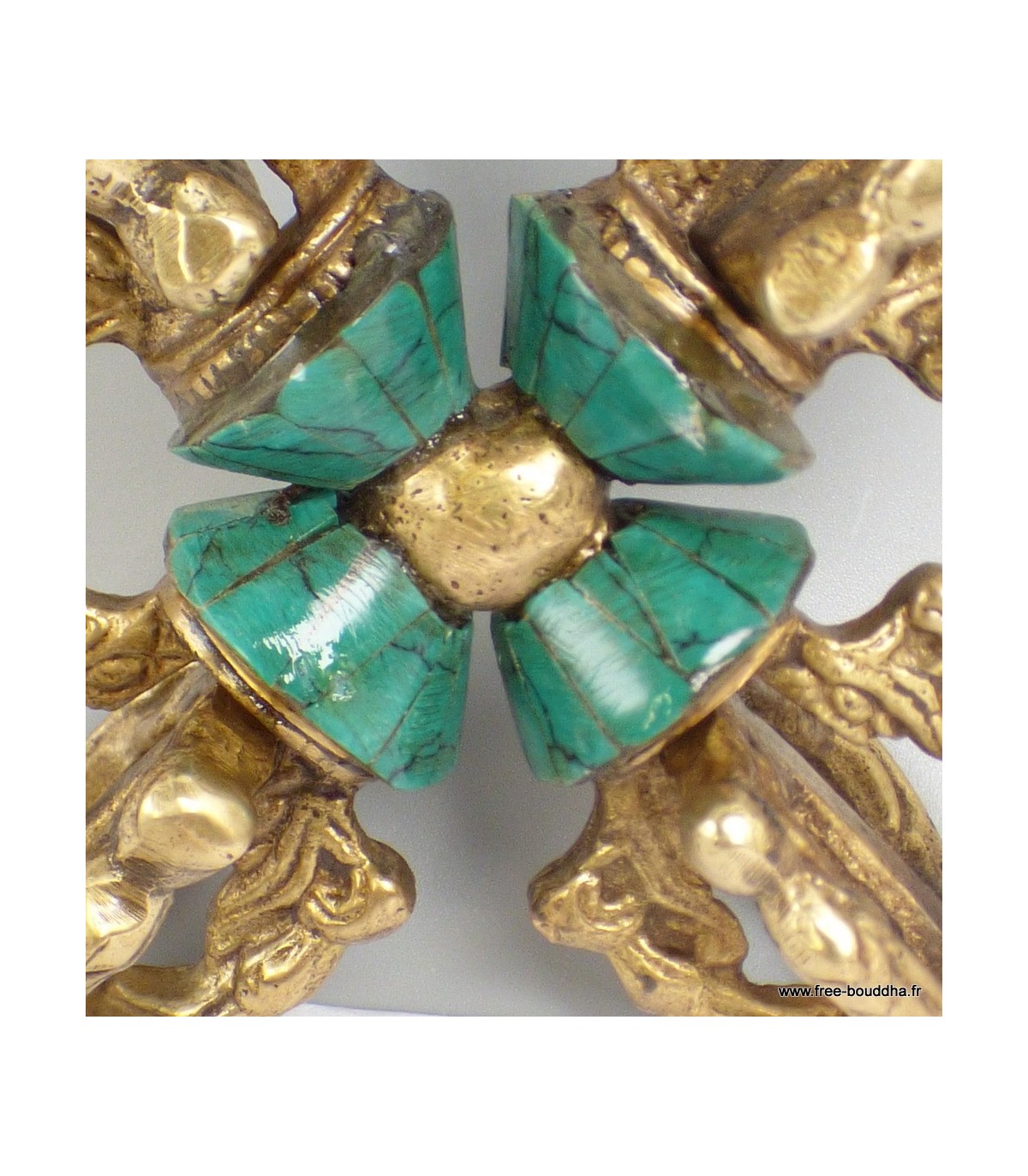 Double dorje vajra bouddhiste - Laiton et turquoise, artisanat du Népal