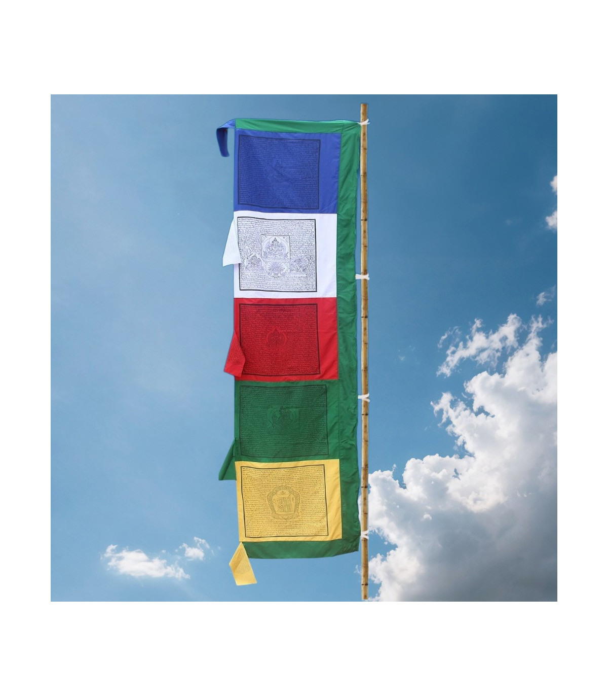 Ces drapeaux tibétains sont fabriqués au Népal et pas en Chine. Ils sont conçus pour être fixés contre un poteau grâce à des lanières sur le côté (pas de renfort) ; les dimensions s'entendent sans les petits volants sur les côtés.
