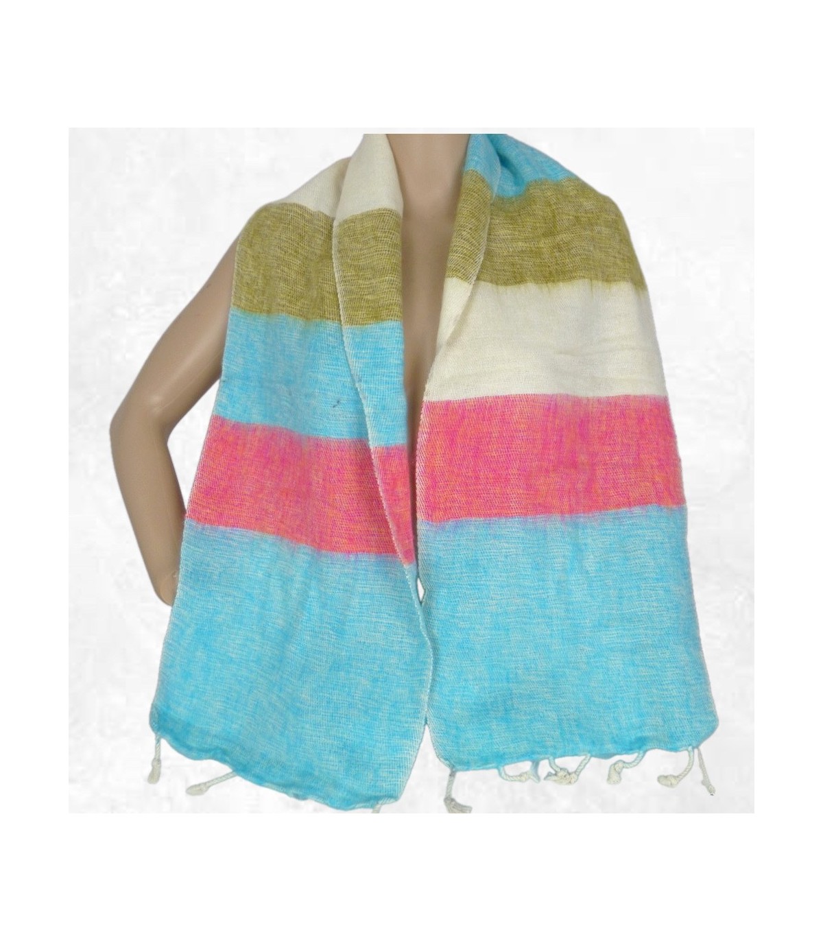 Écharpe à rayures bleu rose kaki – 140 × 30 cm – Népal