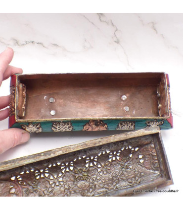 Ce porte-encens tibétain est en cuivre majoritaire, symboles en laiton et serti d'authentiques turquoise et corail.