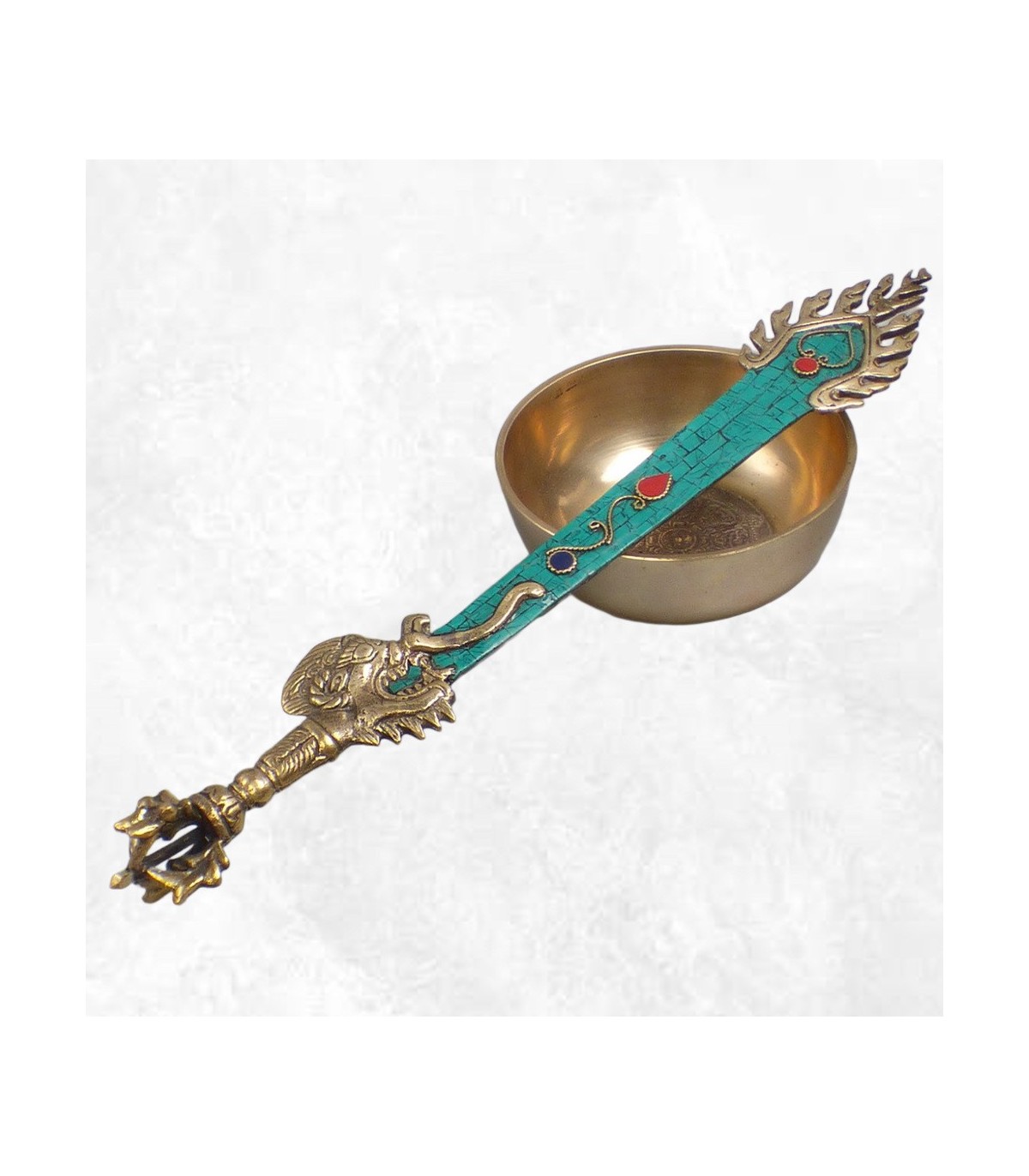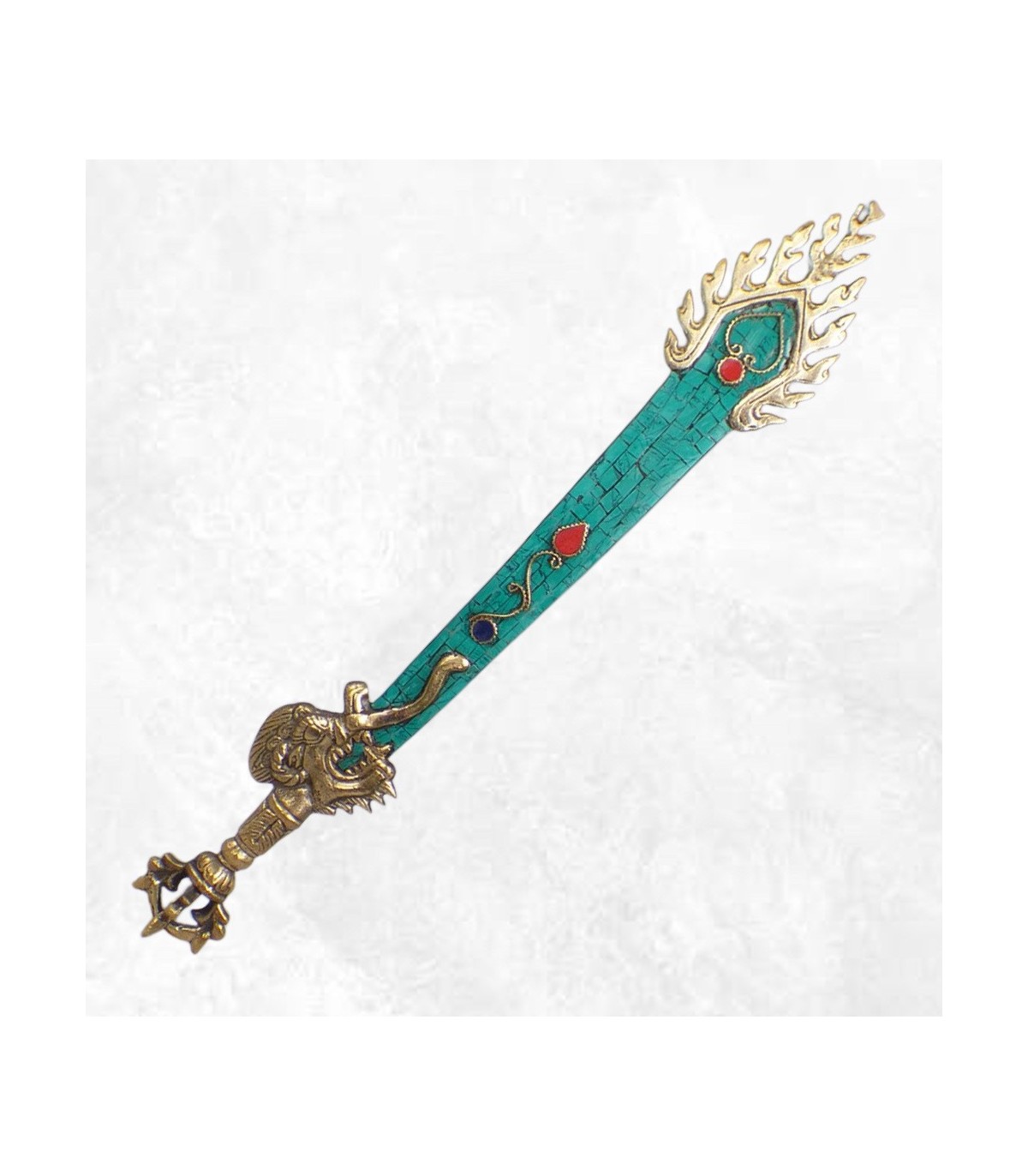 Cette épée rituelle représente l’attribut emblématique de Manjushri, symbole de discernement et de clarté intérieure. Réalisée au Népal, elle associe une structure en métal et laiton à un décor minutieux composé de fragments de pierres naturelles et de perles fantaisie incrustées à la main.