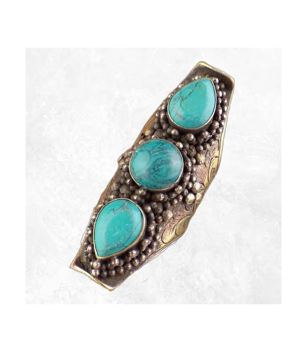 Grosse Bague Tibétaine – Trois Turquoises – Laiton Vieilli