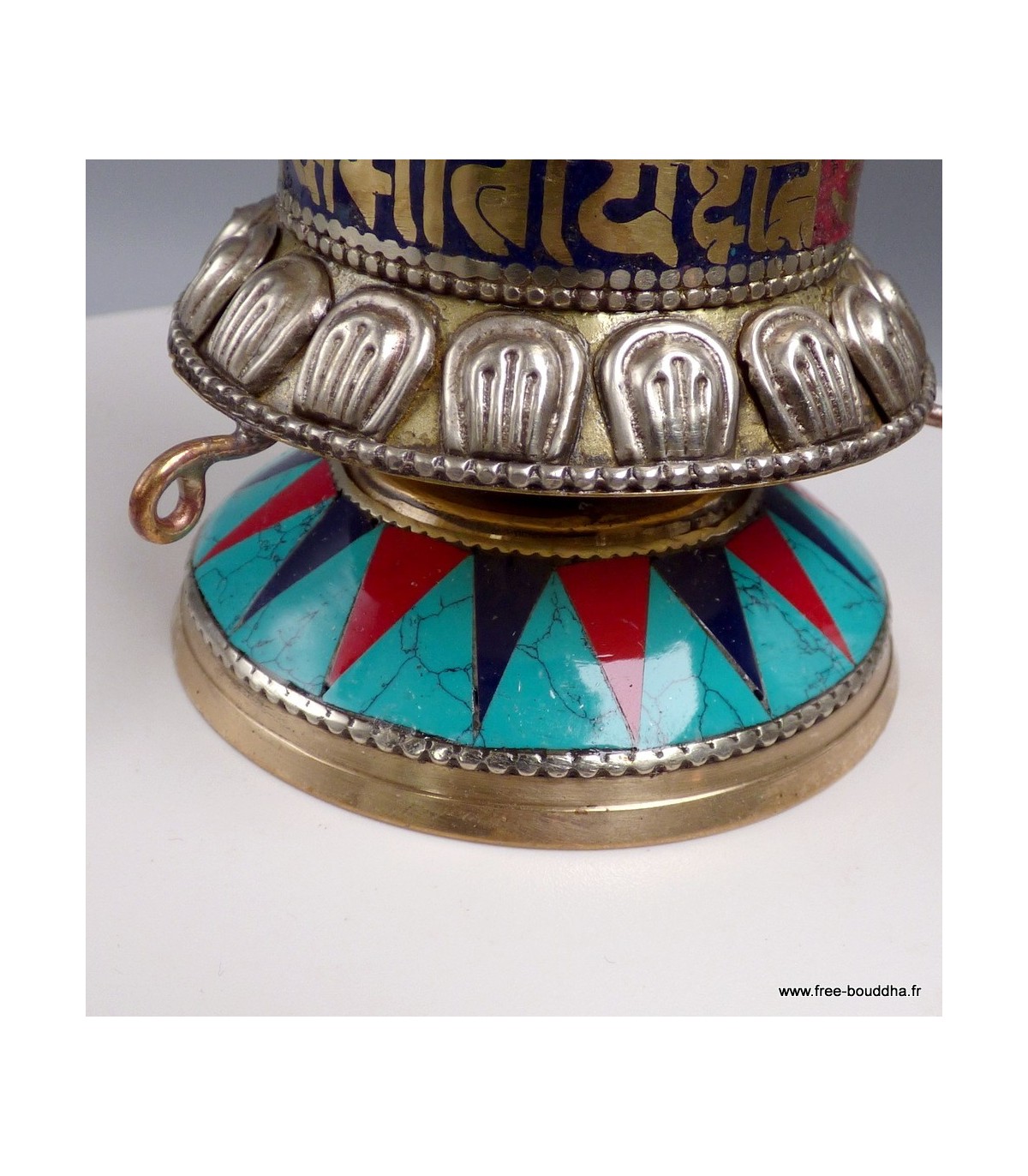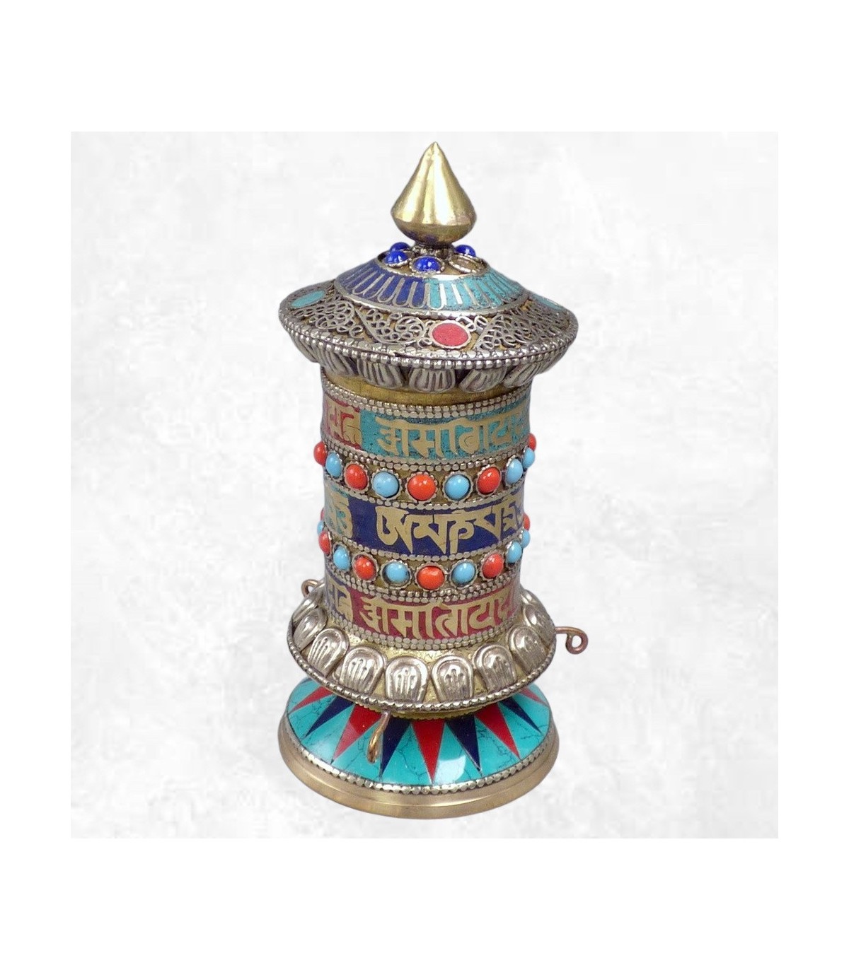 Moulin à prières bouddhiste 3 mantras laiton et pierres 17 cm – Artisanat du Népal