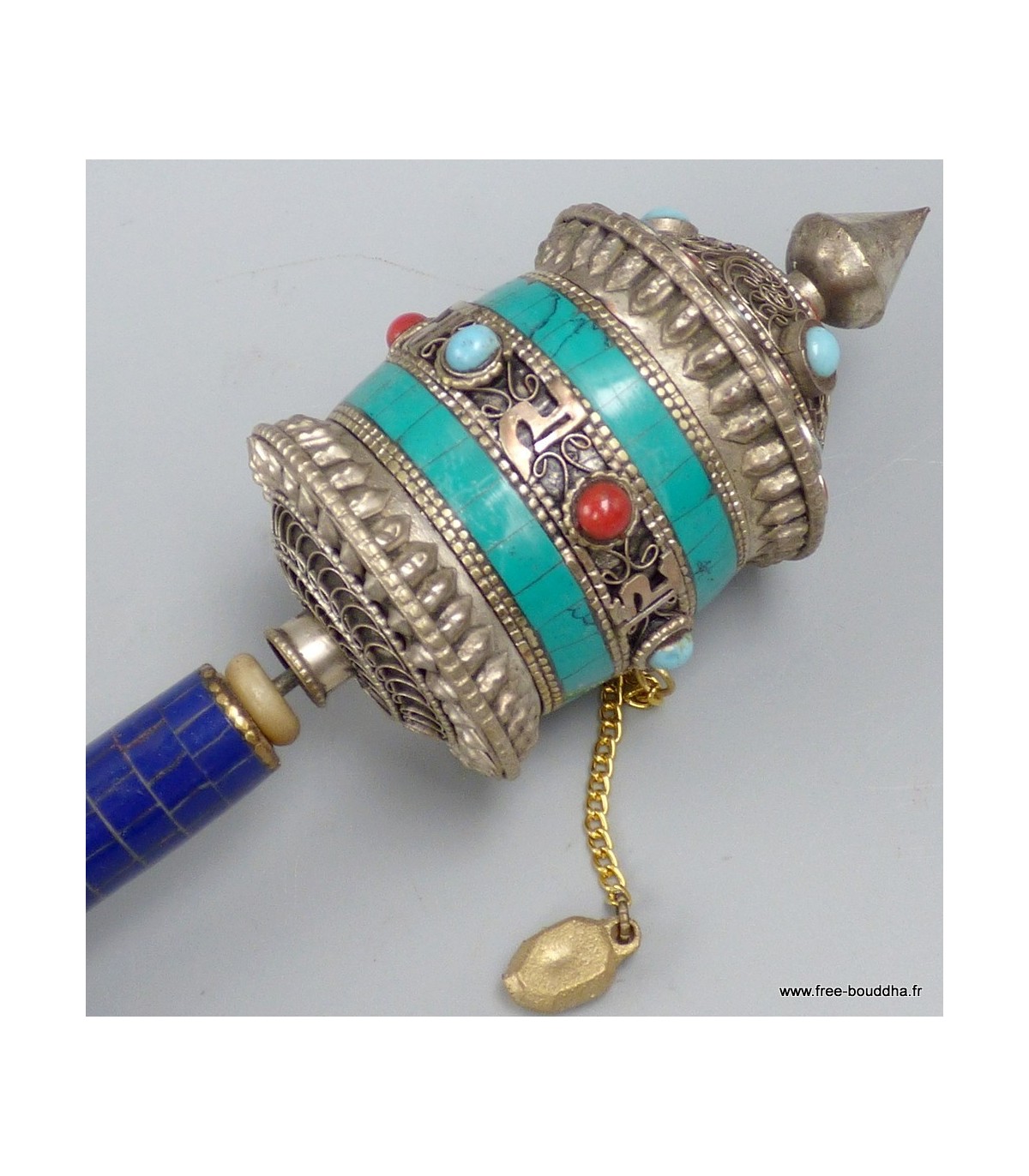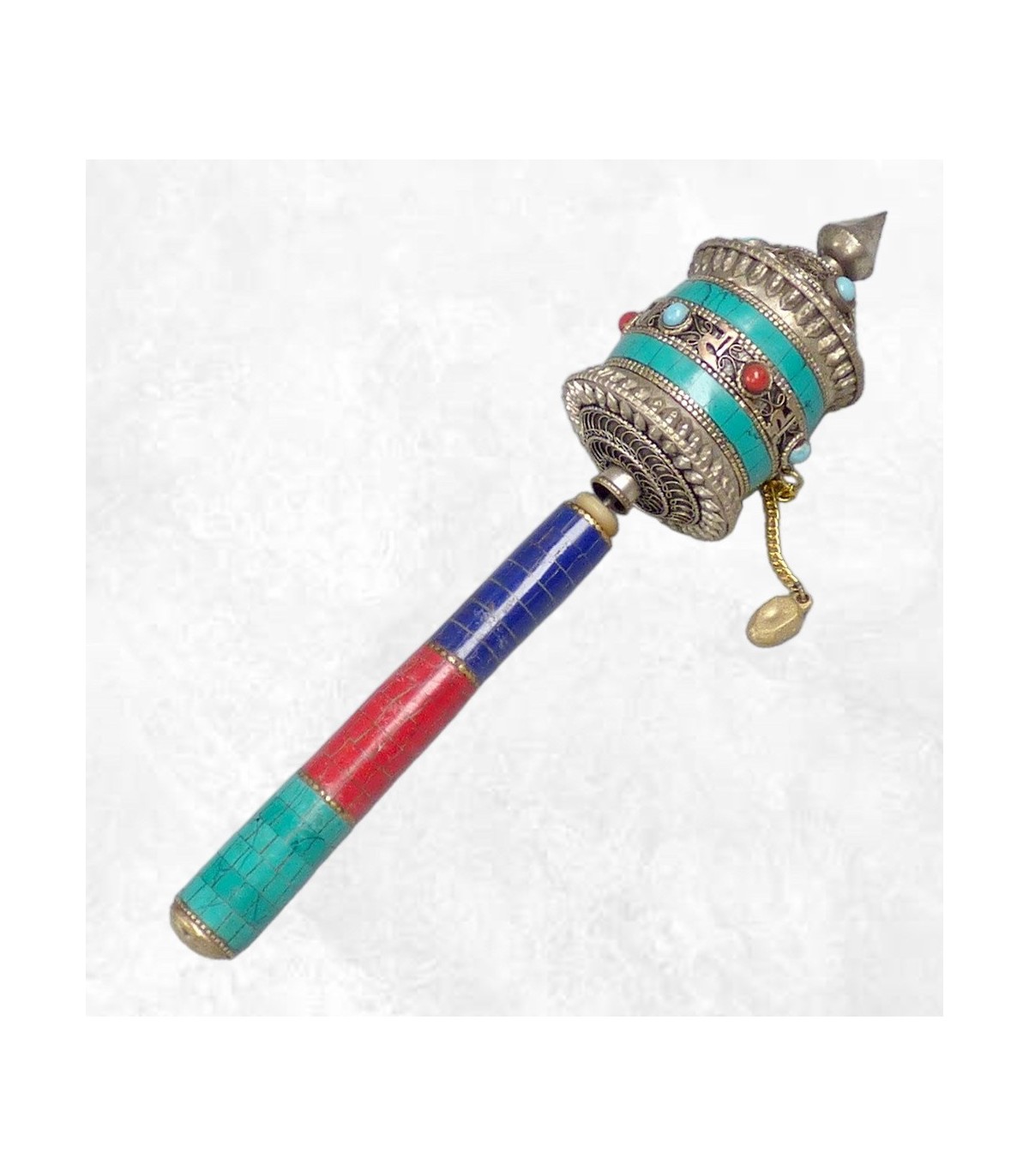 Moulin à prières bouddhiste à main – Métal et turquoise – 20 cm