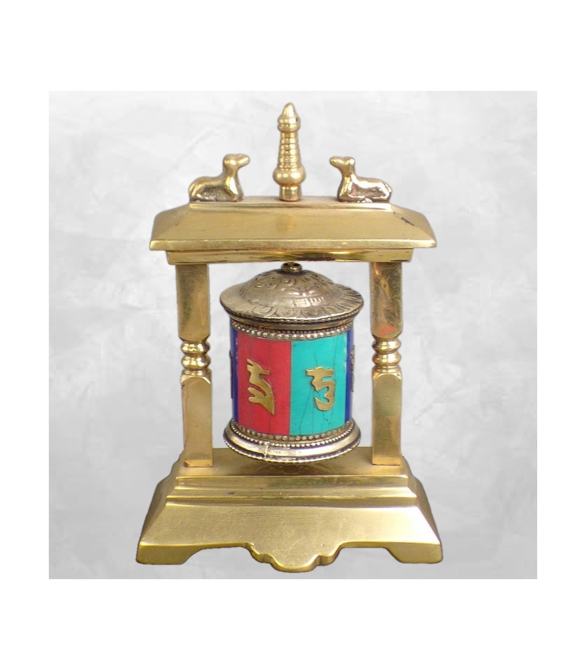 Symbole important du bouddhisme, ce moulin à prières tibétain est une pièce artisanale sacrée, façonnée à la main au Népal. Réalisé en laiton, il est entièrement serti de pierres naturelles : turquoise, lapis lazuli et corail, chacune porteuse d’une vibration spirituelle spécifique. Sa structure en forme de temple est ornée du stupa et des deux biches, symboles emblématiques du bouddhisme tibétain, représentant l’éveil, la compassion et la transmission des enseignements.