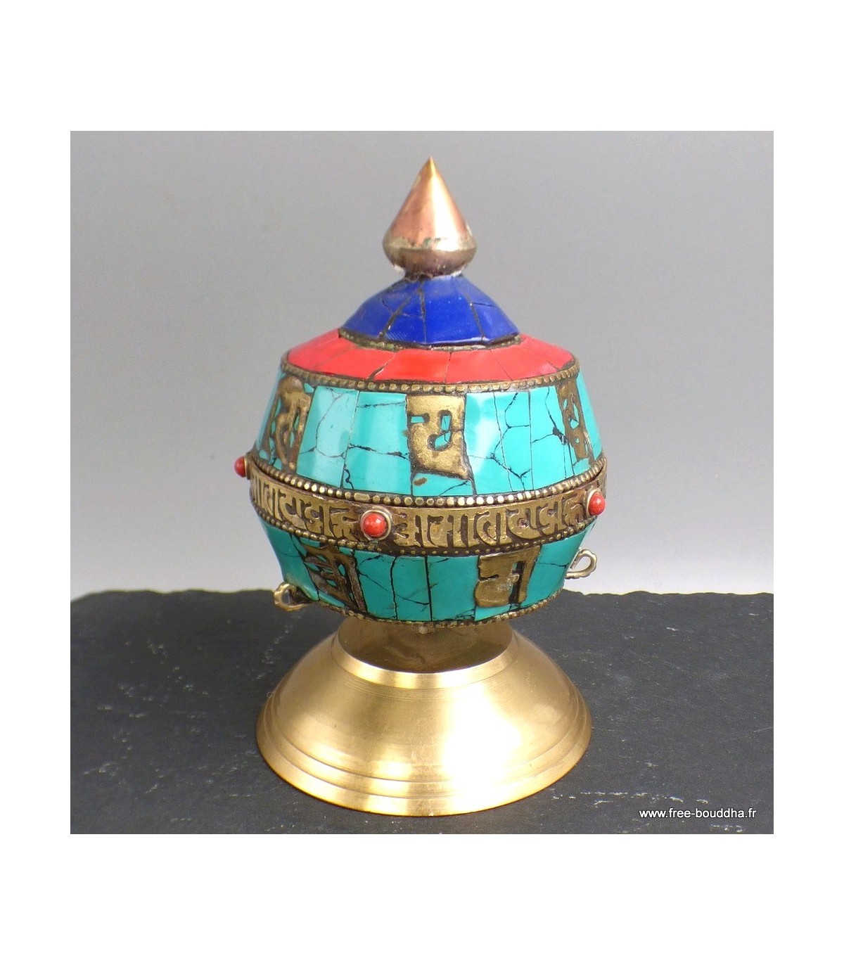 Ce moulin à prières de table, façonné artisanalement au Népal, est une pièce unique qui allie tradition et savoir-faire. Autour de son tambour, des incrustations de turquoise, de corail et de lapis lazuli apportent éclat et énergie, tandis que le mantra de Chenrezi – Om Mani Padme Hum – y est gravé, symbole universel de compassion.