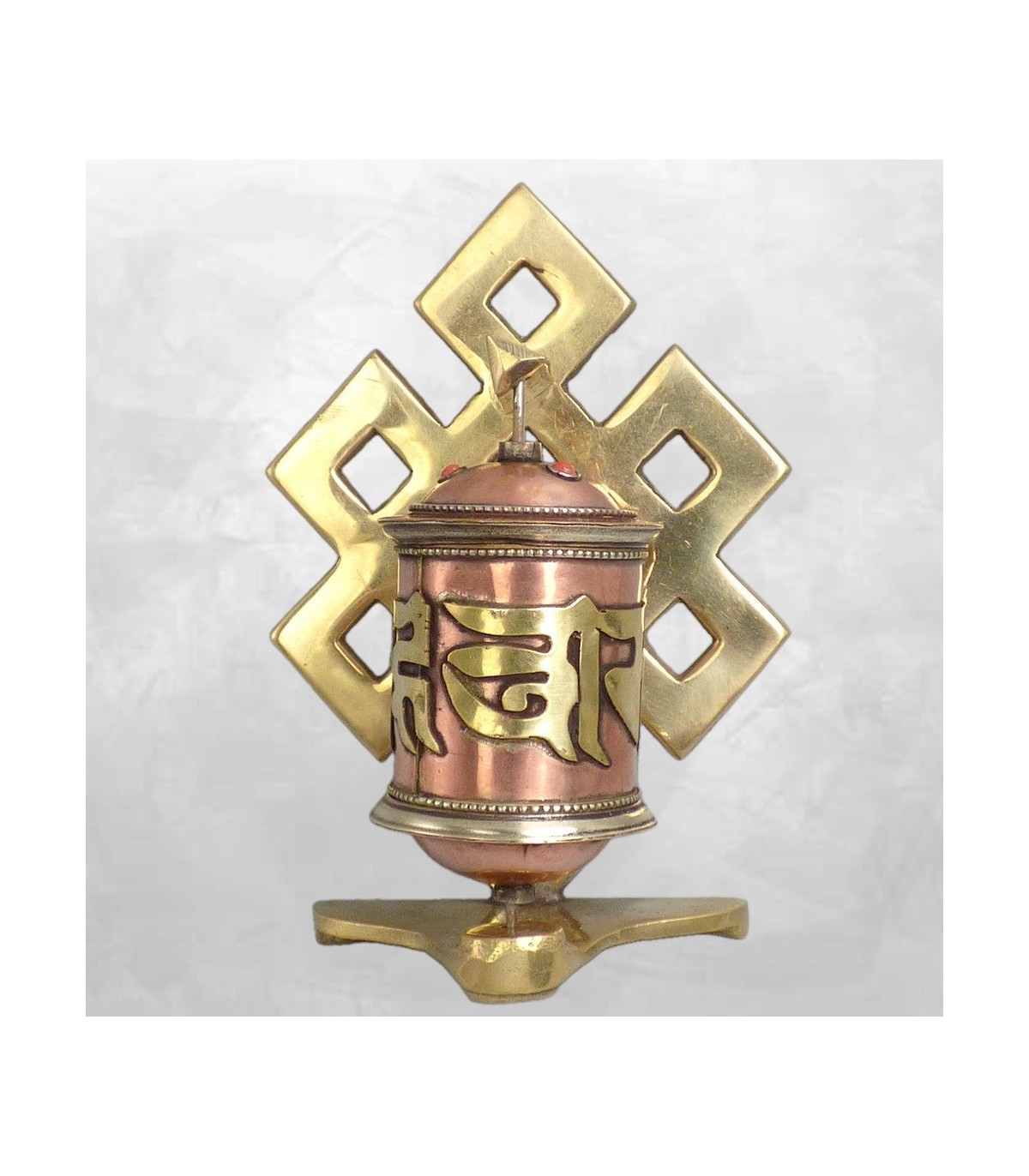 Ce moulin à prières tibétain mural, réalisé en laiton et cuivre, est une pièce artisanale compacte conçue pour un usage polyvalent. Il est décoré du nœud sans fin, l’un des huit signes auspicieux du bouddhisme, symbole de sagesse infinie et d’interdépendance. Grâce à sa base stable et à sa patte de fixation, il peut être installé sur un mur ou simplement posé sur un meuble selon la pratique souhaitée.