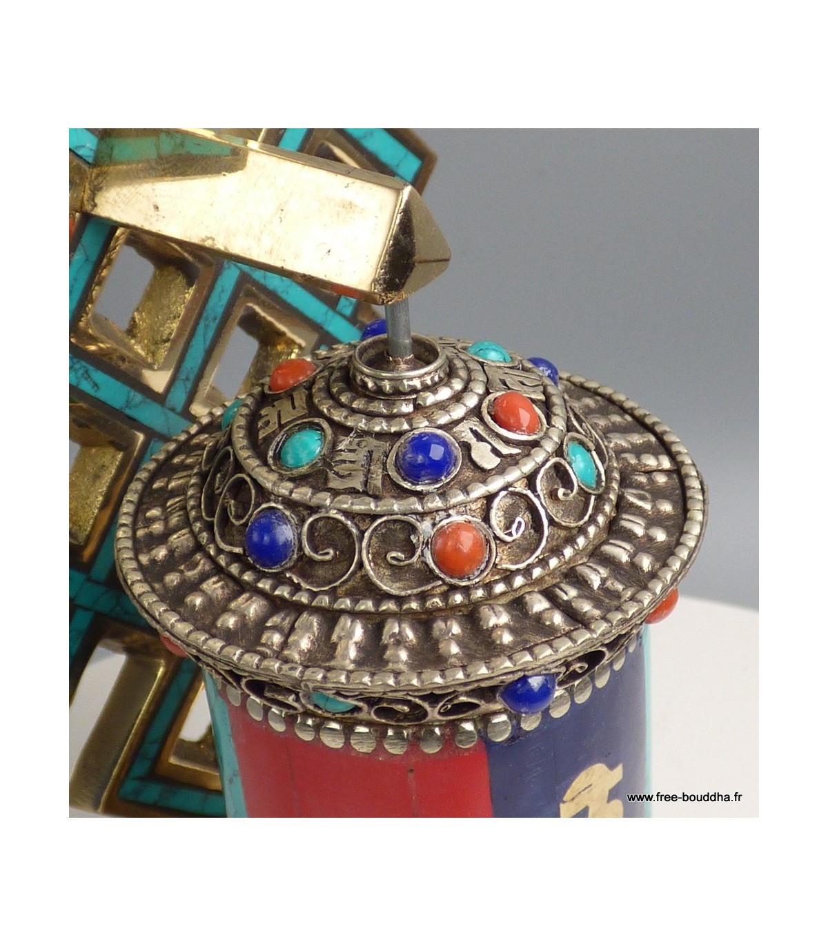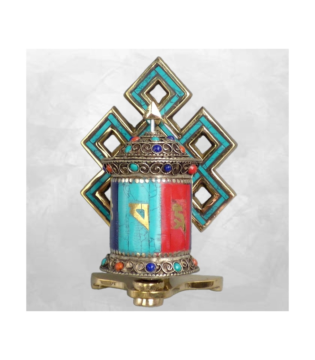 - Ornement principal : nœud sans fin tibétain décoré de turquoise
