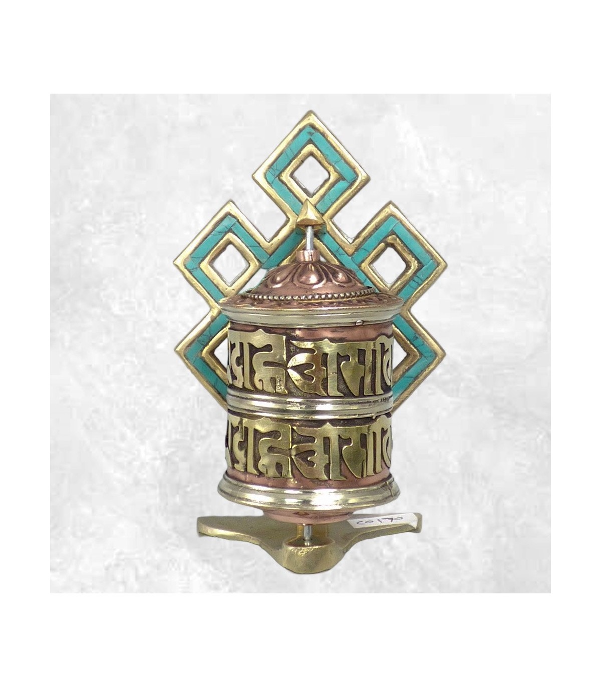 Ce moulin à prières bouddhiste mural est une pièce artisanale compacte et polyvalente, réalisée en laiton sculpté et ornée d’un nœud sans fin turquoise, l’un des huit signes auspicieux du bouddhisme tibétain. Grâce à sa base stable et à sa patte de fixation, il peut être posé sur une table ou fixé contre un mur selon l’usage souhaité. Sa finition turquoise apporte une touche lumineuse et symbolique, renforçant son caractère spirituel et décoratif.