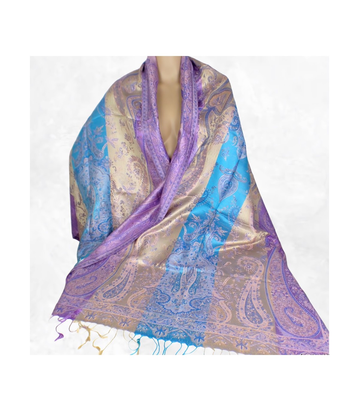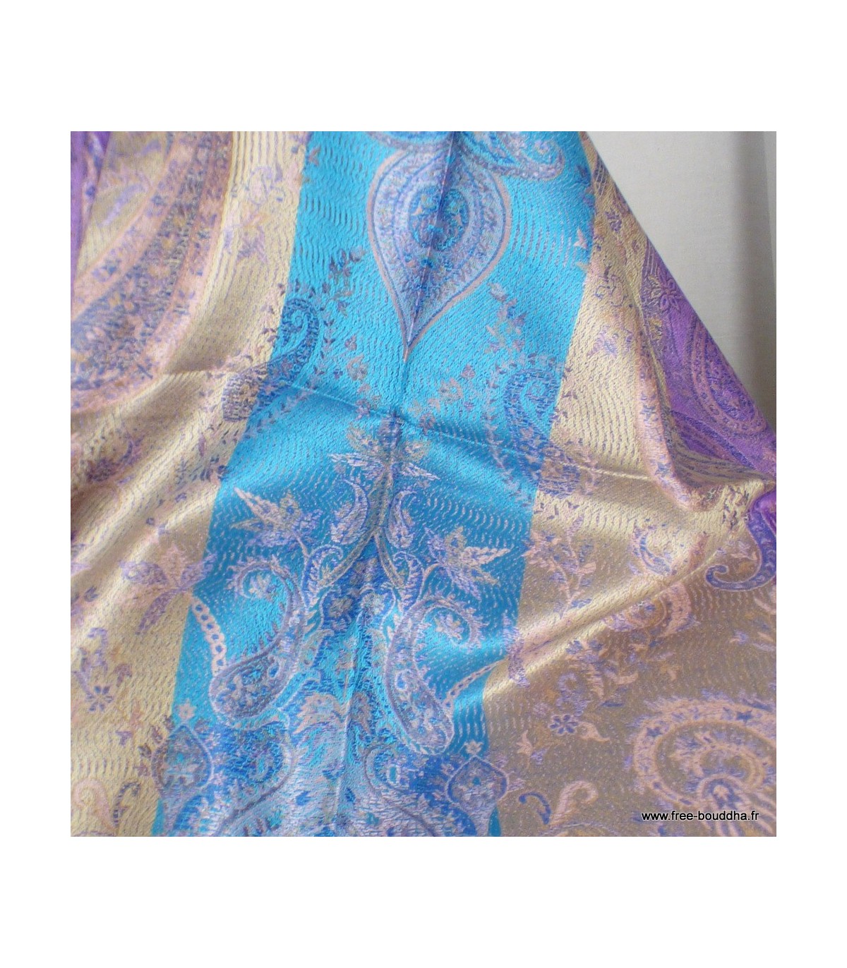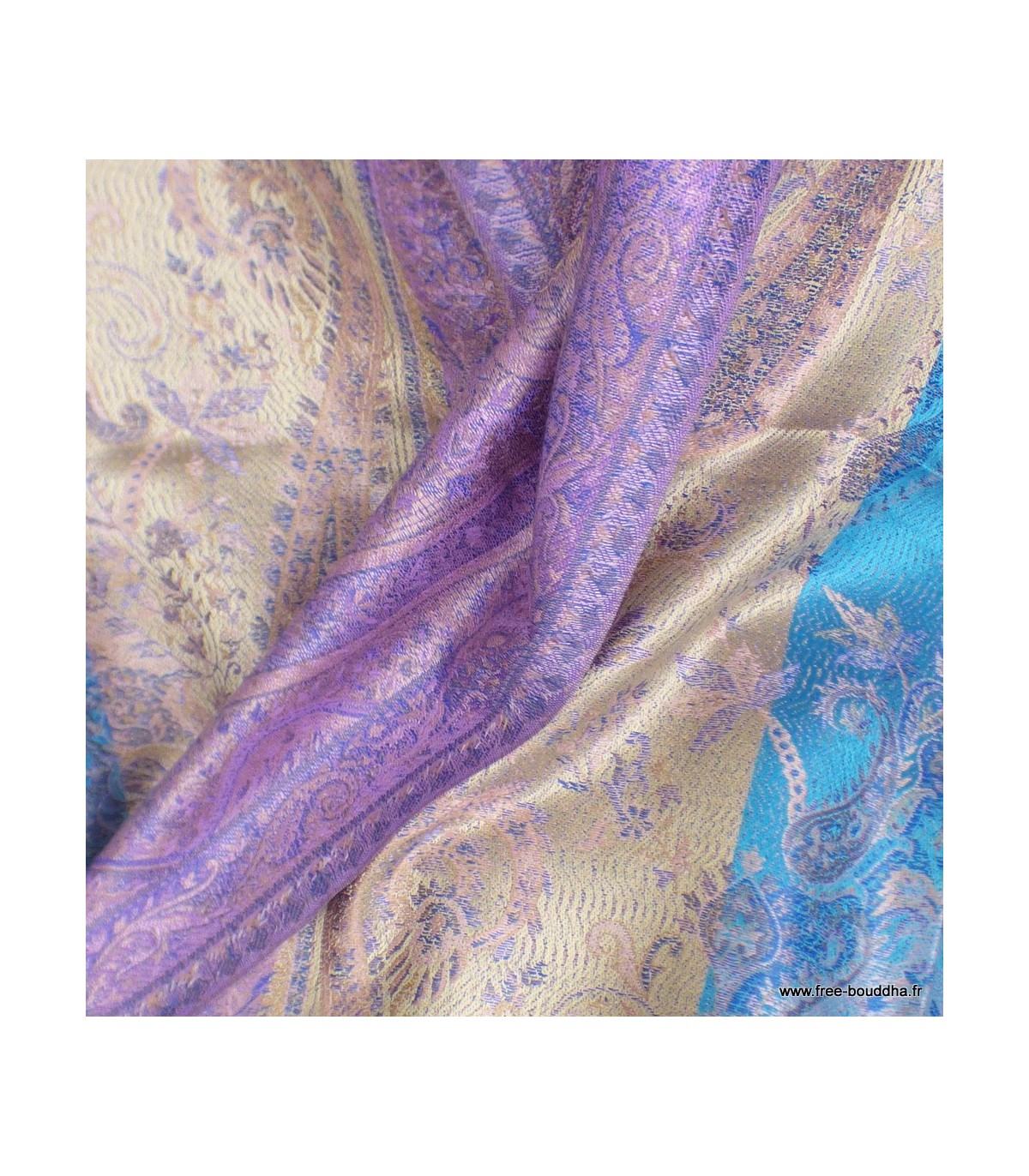 Pashmina en soie véritable – Bleu violet & or motifs cachemire
