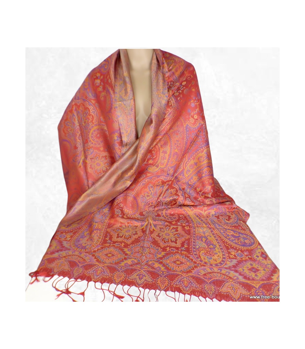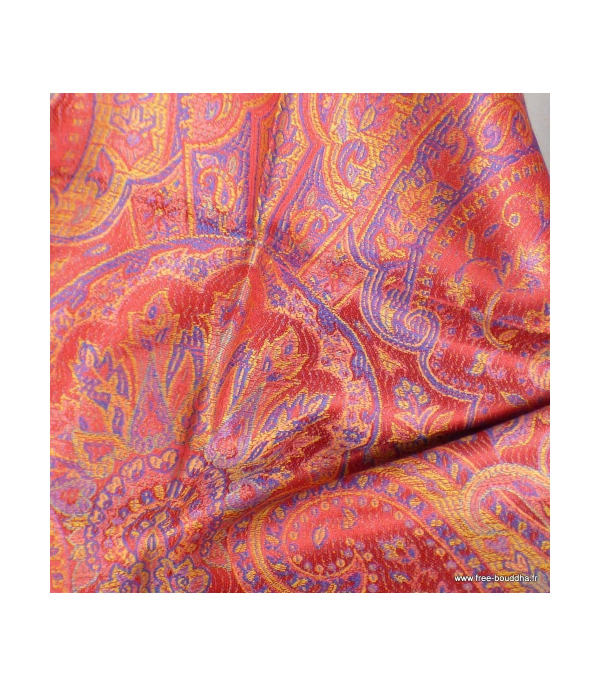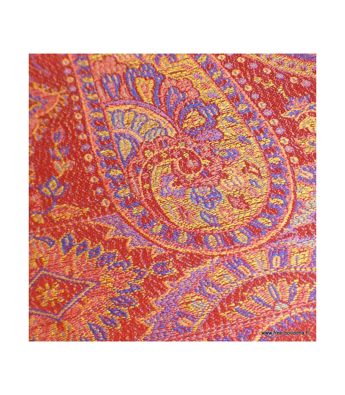 Pashmina en soie véritable – Rouge vermillon avec pointes de bleu motifs cachemire