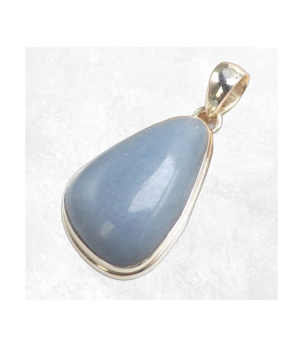 Ce pendentif Angelite est d'une belle couleur uniforme bleu jean. Pierre d'ancrage très douce, cette angélite est montée sur argent.