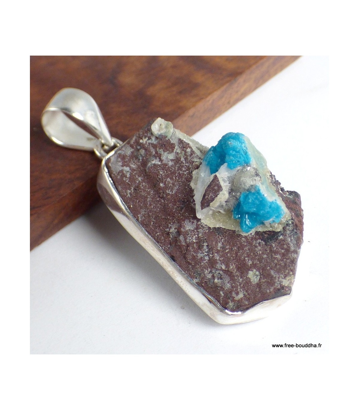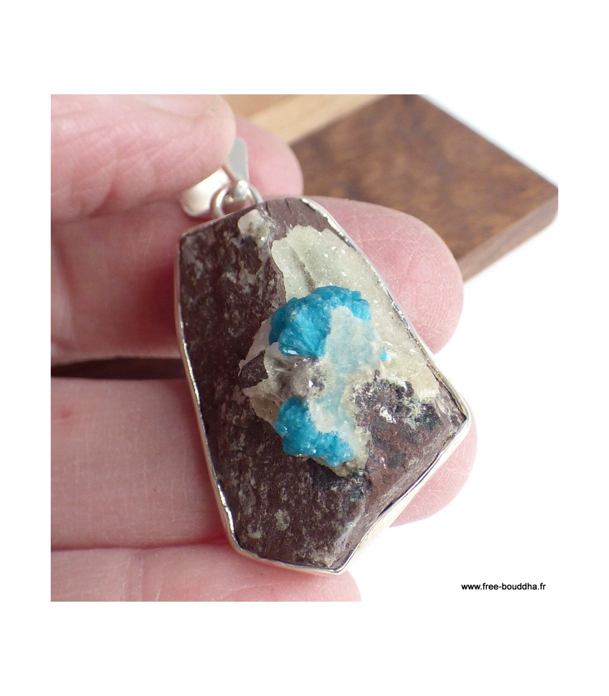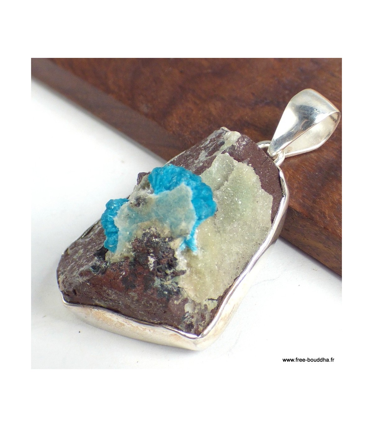 Ce pendentif est serti d’un authentique cristal de Cavansite sur roche-mère, pierre rare aux nuances bleu turquoise éclatantes, nichée sur une base minérale grise scintillante. Sa monture en argent 925 poinçonné met en valeur la beauté naturelle et brute de la gemme, tout en garantissant solidité et élégance. Chaque pièce est un bijou unique, livré avec certificat d’authenticité.