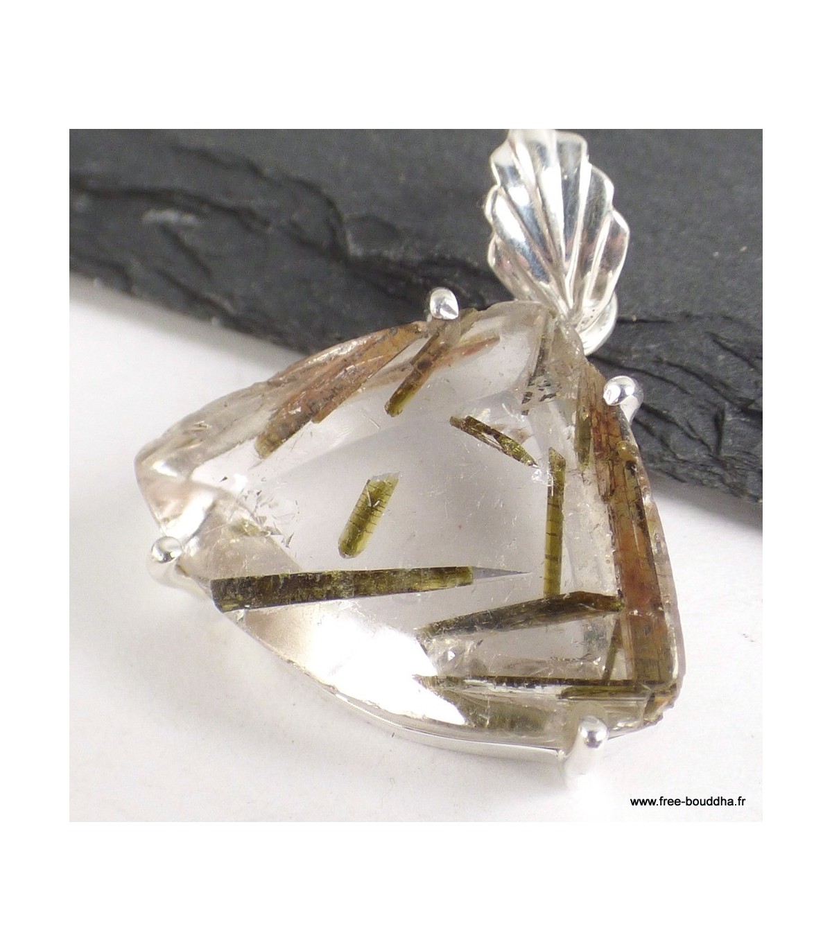 Pendentif Epidote sur Quartz bélière feuille et argent 925