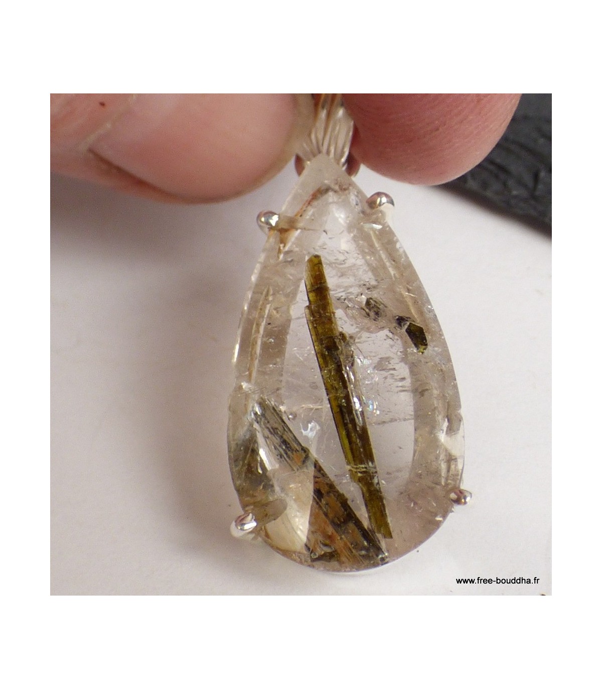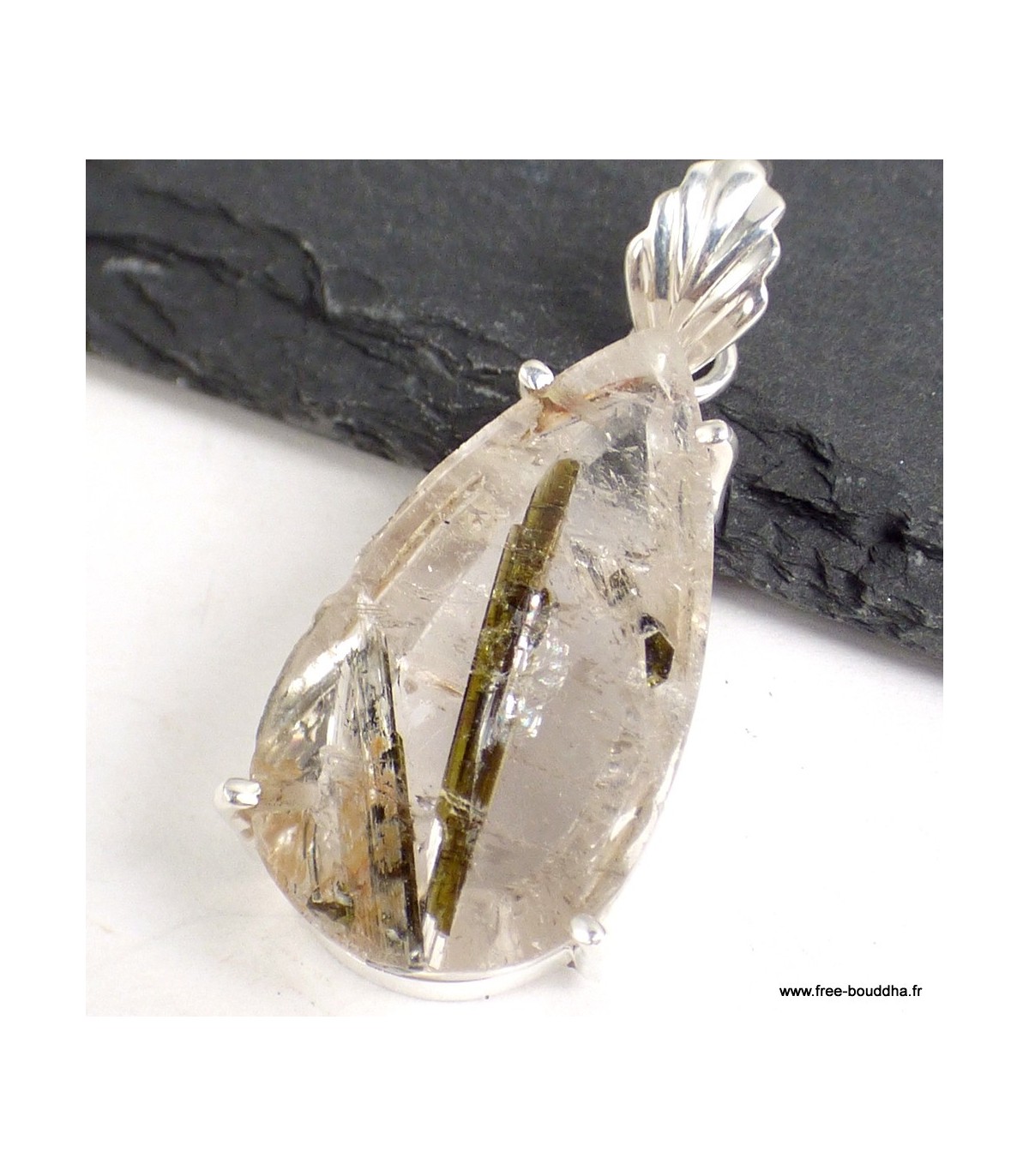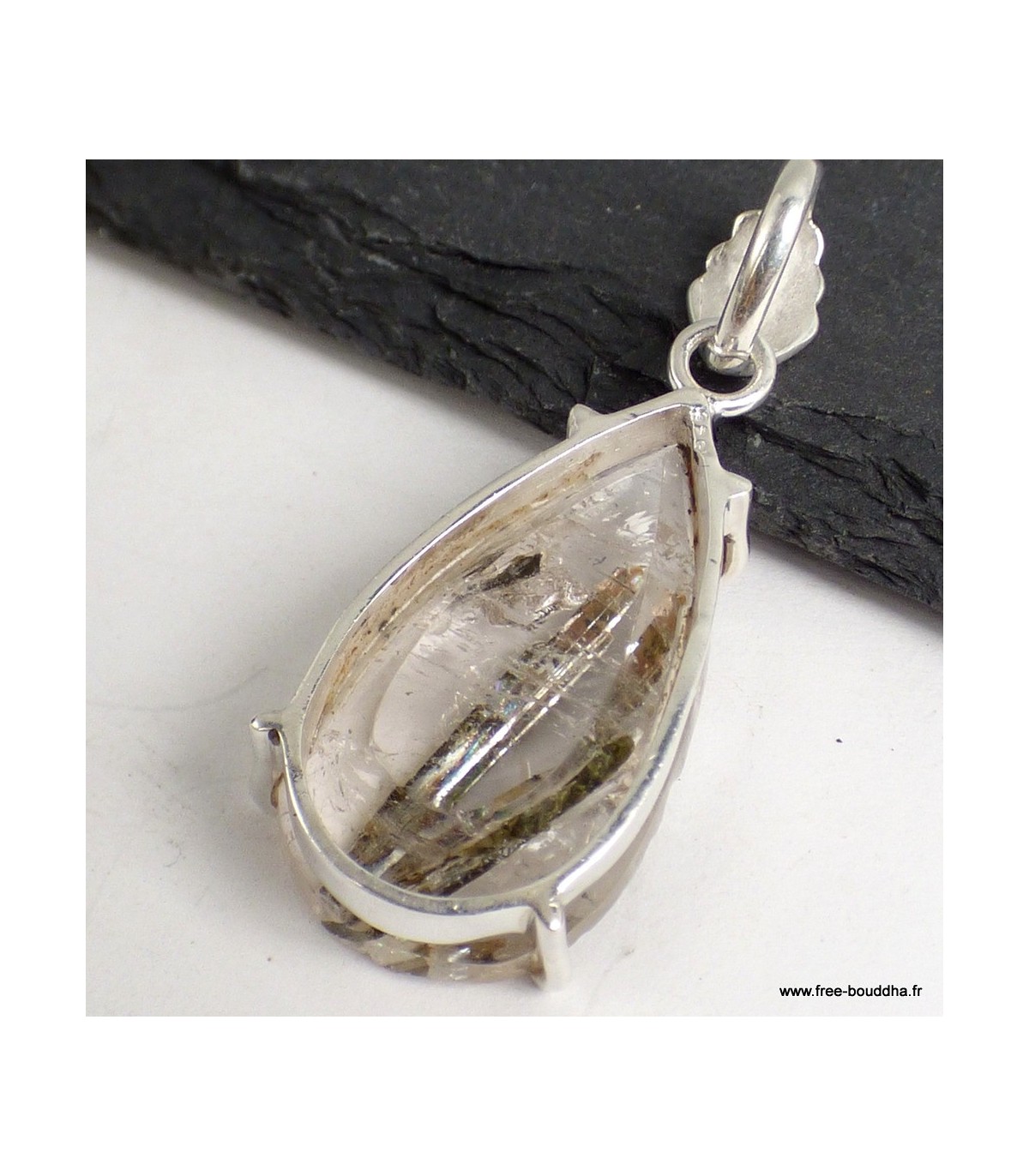 Pendentif en Épidote sur Quartz forme goutte – Argent 925 poinçonné