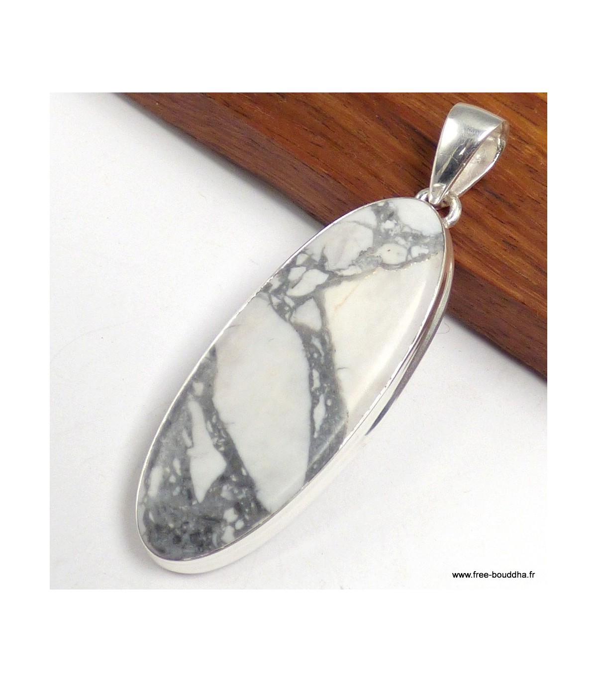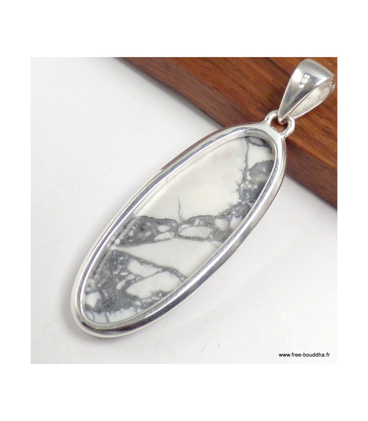 Ce pendentif met en valeur une Howlite blanche véritable, reconnaissable à ses veines grises naturelles et à son énergie douce et apaisante. Sa forme allongée lui donne une allure élégante et élancée, parfaite pour un bijou quotidien ou un style plus habillé. La monture en argent massif 925 poinçonné apporte une finition lumineuse et intemporelle.