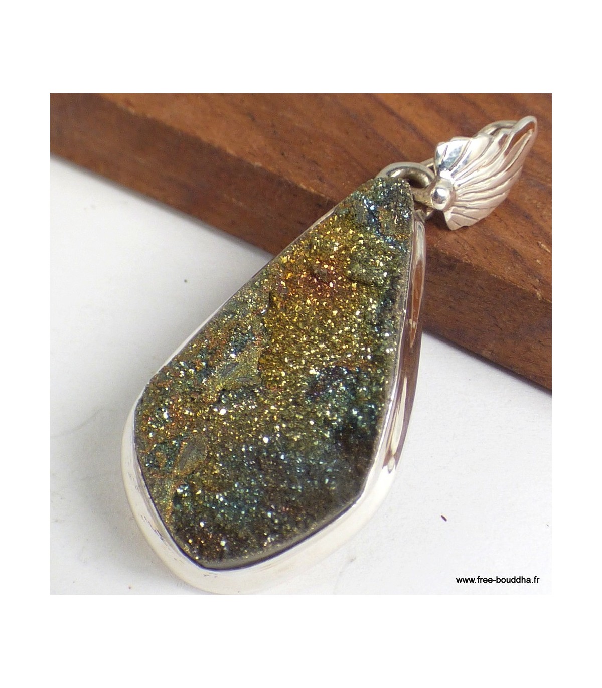 Ce pendentif met en valeur une authentique Pyrite arc-en-ciel, pierre rare aux reflets métalliques irisés allant du doré au violet. Sa bélière en forme de feuille apporte une touche organique et élégante. Sertissage en argent 925 poinçonné, garantissant qualité et durabilité. Chaque bijou est livré avec son certificat d’authenticité.