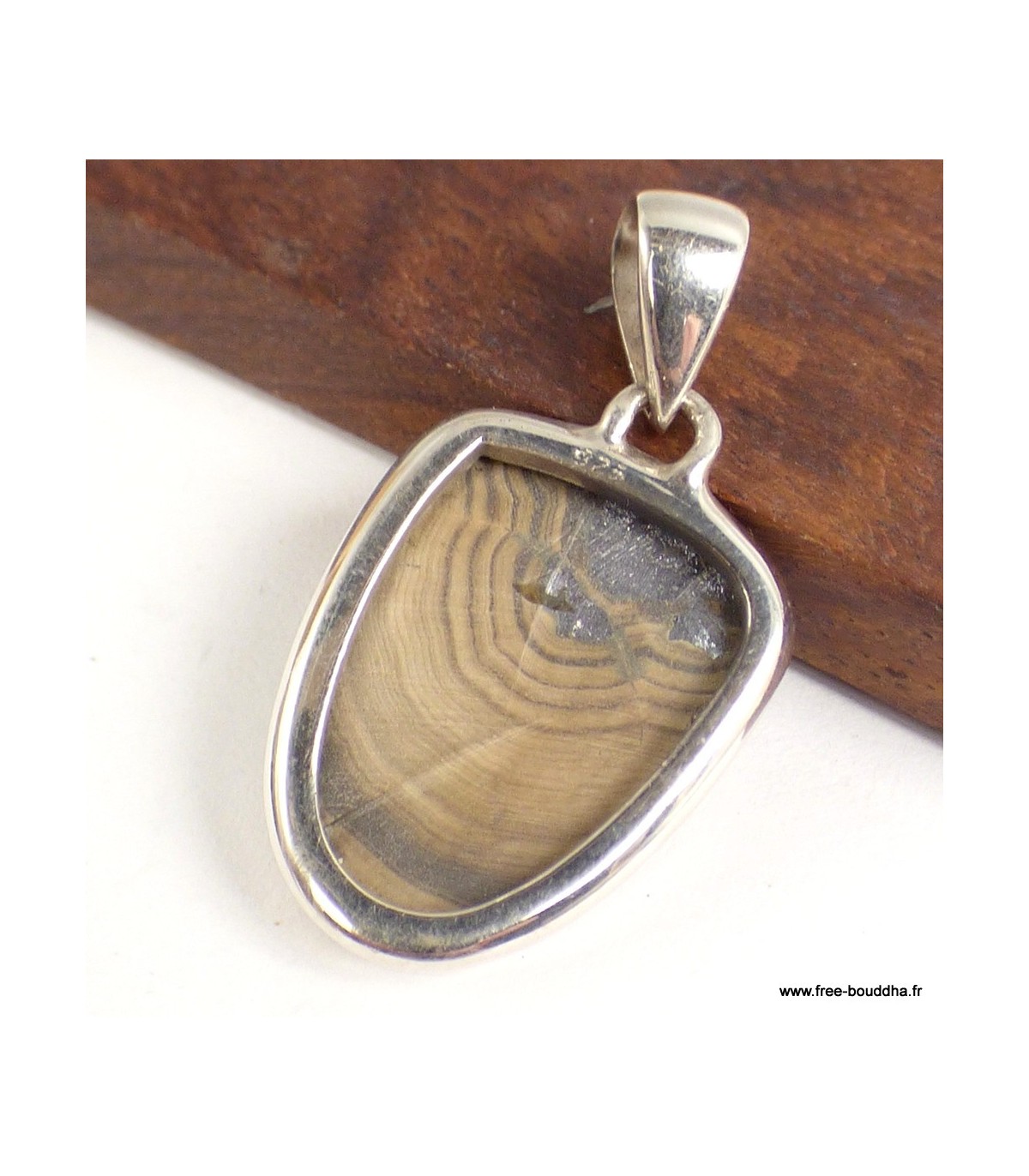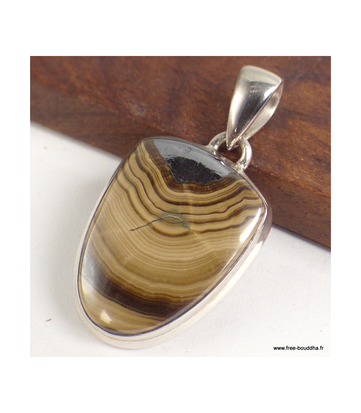 Ce pendentif met en valeur une authentique Schalenblende d’Allemagne, pierre rare aux teintes brunes, dorées et grises. Ses stries naturelles sont l’expression unique de sa formation géologique et ne constituent pas des défauts. Sertissage en argent 925 poinçonné, garantissant élégance et durabilité. Chaque bijou est livré avec son certificat d’authenticité.