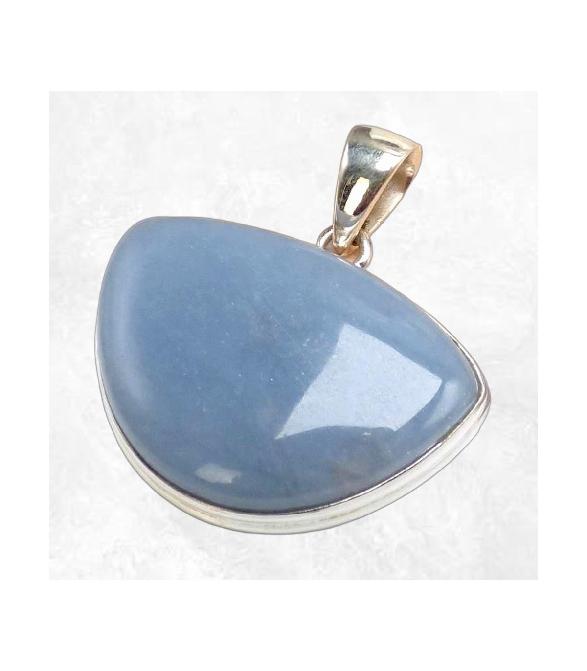 Ce pendentif Angelite est d'une belle couleur uniforme bleu jean. Pierre d'ancrage très douce, cette angélite est montée sur argent.