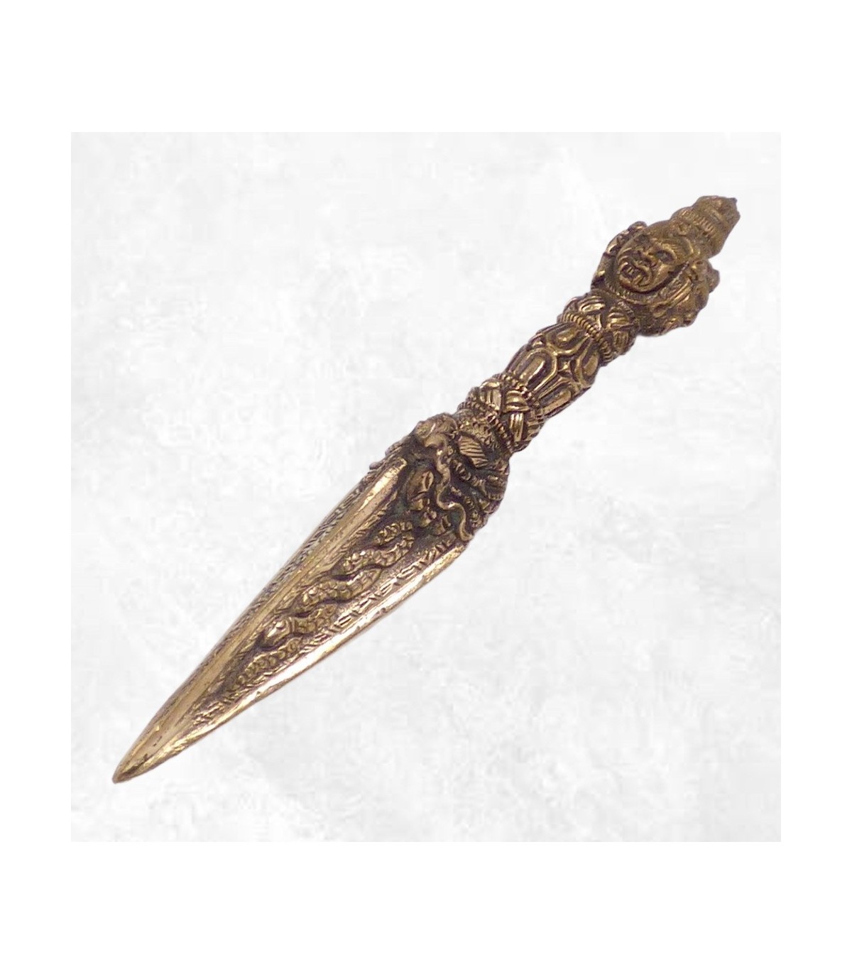 Ce phurba bouddhiste en laiton de 12,5 cm est une pièce rituelle traditionnelle, façonnée au Népal avec un travail artisanal précis. Sa structure symbolique suit l’organisation classique des phurbas tantriques, avec une iconographie particulièrement puissante :