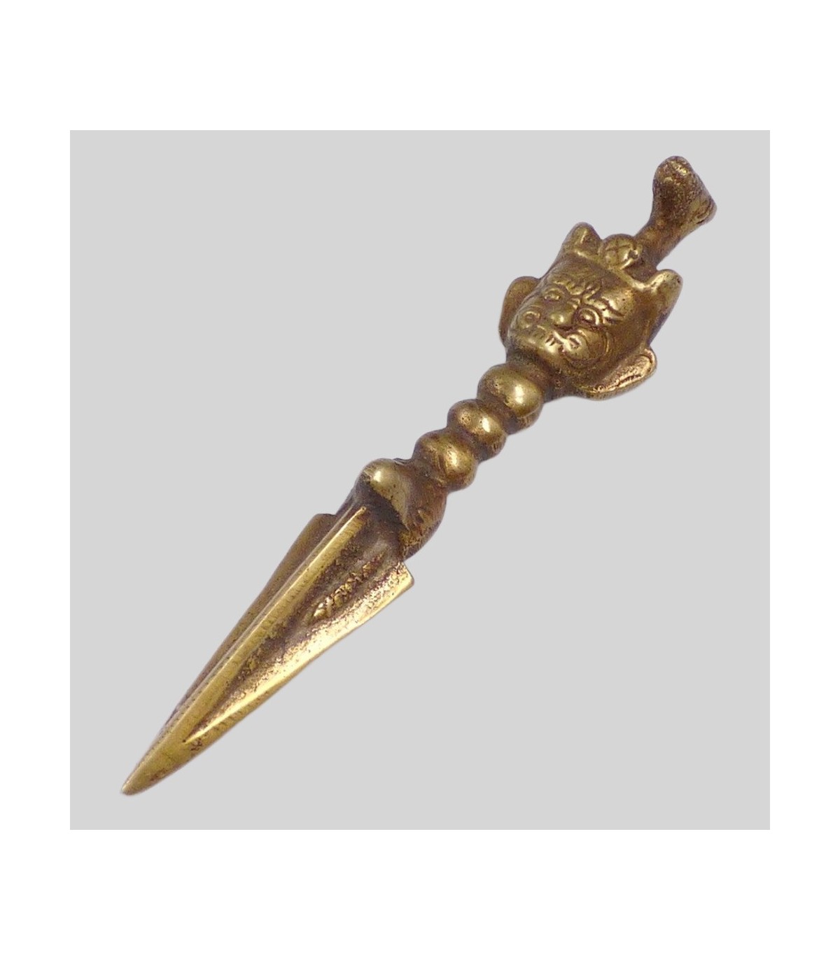 Ce phurba tibétain authentique de petite taille est un modèle pratique à emporter en voyage ou à intégrer dans un autel compact. Entièrement façonné à la main au Népal, il est réalisé en laiton et orné d’une tête de Guru Rinpoché, figure essentielle du bouddhisme tantrique.